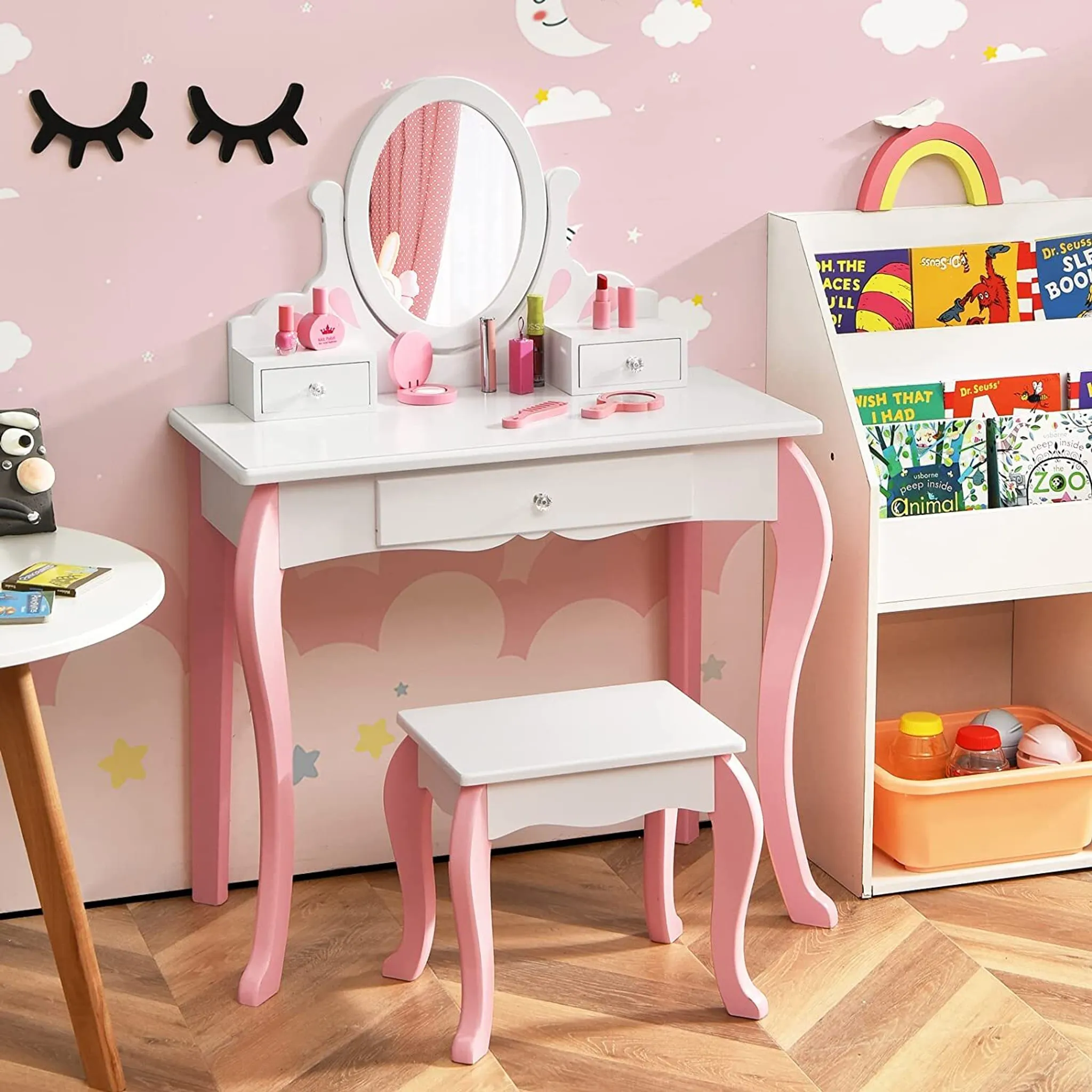 Deine kleine Prinzessin wird vor Freude strahlen! Dieser komplette Schminktisch mit Hocker bringt den Beauty-Salon direkt ins Kinderzimmer. Mit Musik, Licht und jeder Menge Zubehör wird jeder Tag zum Frisier-Spaß.