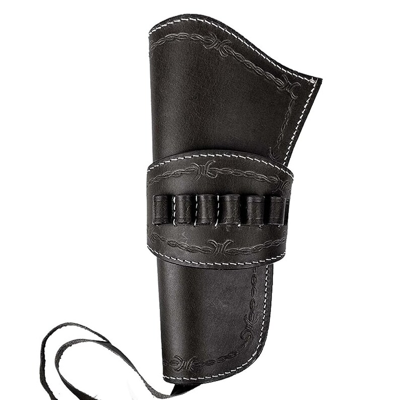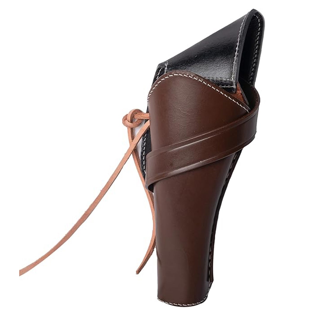 Yeehaw! Dieses authentische Western-Holster aus echtem Leder bringt Wilder-Westen-Feeling in deine Sammlung! Perfekt für Revolver im Kaliber .22, .38, .44, .45, .357 und .358 - für die meisten Lauflängen von 4 bis 8 Zoll. Mit verstellbarer Hammerschlaufe und Beinriemen hält die Waffe sicher an Ort und Stelle. Die robusten Nähte garantieren lange Freude, und das gealterte Leder sieht einfach klasse aus! Rechtshänder-Modell, ideal für Heritage Rough Rider, 1875 Remington und ähnliche Revolver. Ob fürs Cosplay, die Sammlung oder den Schießstand - dieses Holster vereint Tradition mit Funktionalität. Ein echter Hingucker auf jedem Western-Event! Das Leder ist bereits vorgeweicht für sofortigen Tragekomfort. Ein Stück amerikanische Geschichte, das nicht nur gut aussieht, sondern auch praktisch ist. Für alle, die den Spirit des Wilden Westens lieben!