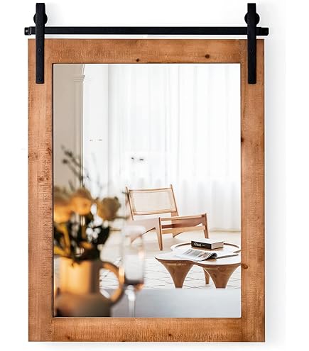 Wunderschöner Wandspiegel der jeden Raum aufwertet! Mit 76,5x56cm Gesamtmaß ist er genau die richtige Größe für Flur, Wohnzimmer oder Schlafzimmer. Der massive Holzrahmen gibt ihm Stabilität und den typischen Rustikal-Charme. Die schwarze Metallhalterung setzt coole Akzente und ist rostfrei beschichtet. Aber das Beste: Der Spiegel hat eine bruchsichere Schutzschicht - extra sicher für zu Hause! Die Spiegelfläche von 57x43cm bietet genug Platz zum Betrachten und die HD-Qualität gibt dir ein klares, unverzerrtes Bild. Perfekt zum Schminken, Anziehen oder einfach als Deko-Element. Der Scheunentor-Stil passt super zu Landhaus- oder Vintage-Einrichtungen. Montage ist super einfach dank vorgebohrter Löcher - du brauchst nur noch die passenden Schrauben. Mit 4kg Gewicht sitzt er stabil an der Wand. Einfach aufhängen und dein Zimmer wirkt gleich größer und heller!