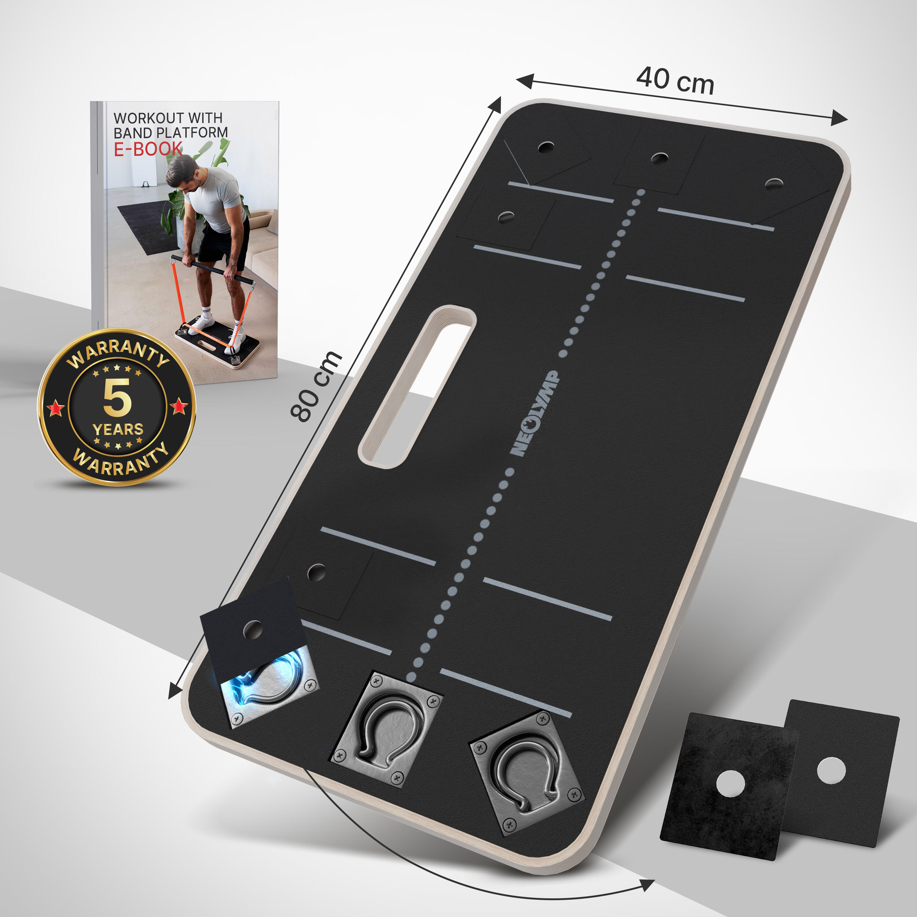 Dein Home-Gym Upgrade! Diese robuste Bänderplattform von NEOLYMP macht Training mit Fitnessbändern richtig effektiv. Aus stabilem Mehrschichtholz mit integrierten Metallösen - da kannst du alle deine Widerstandsbänder sicher befestigen. Die Grip Tape Oberfläche und rutschfeste Gummi-Unterseite geben dir perfekten Halt. Mit magnetischen Abdeckplatten für ungenutzte Ösen - so hast du maximale Bewegungsfreiheit. Kompakt 80x40cm groß mit praktischem Tragegriff - super mobil und platzsparend. Perfekt für Full-Body Workouts, Mobility Training oder Rehabilitation. 5 Jahre Garantie inklusive!