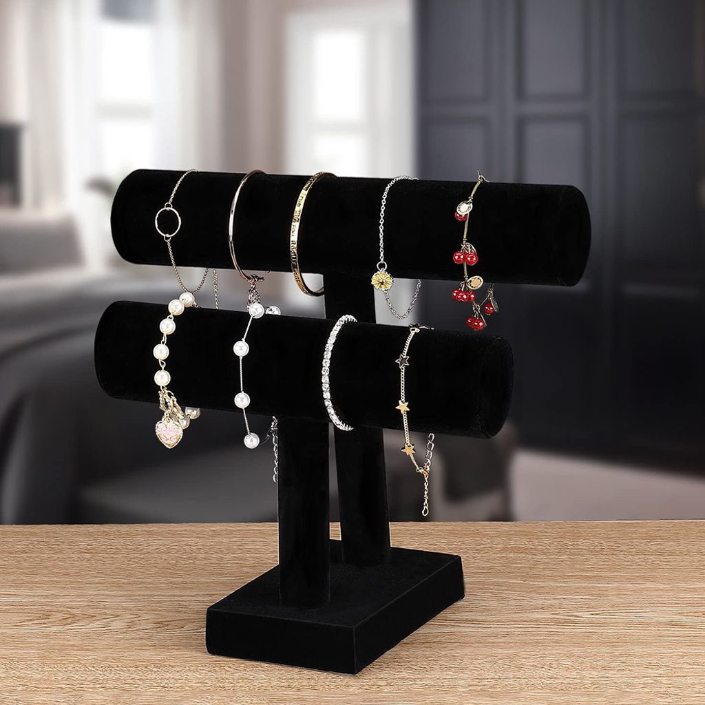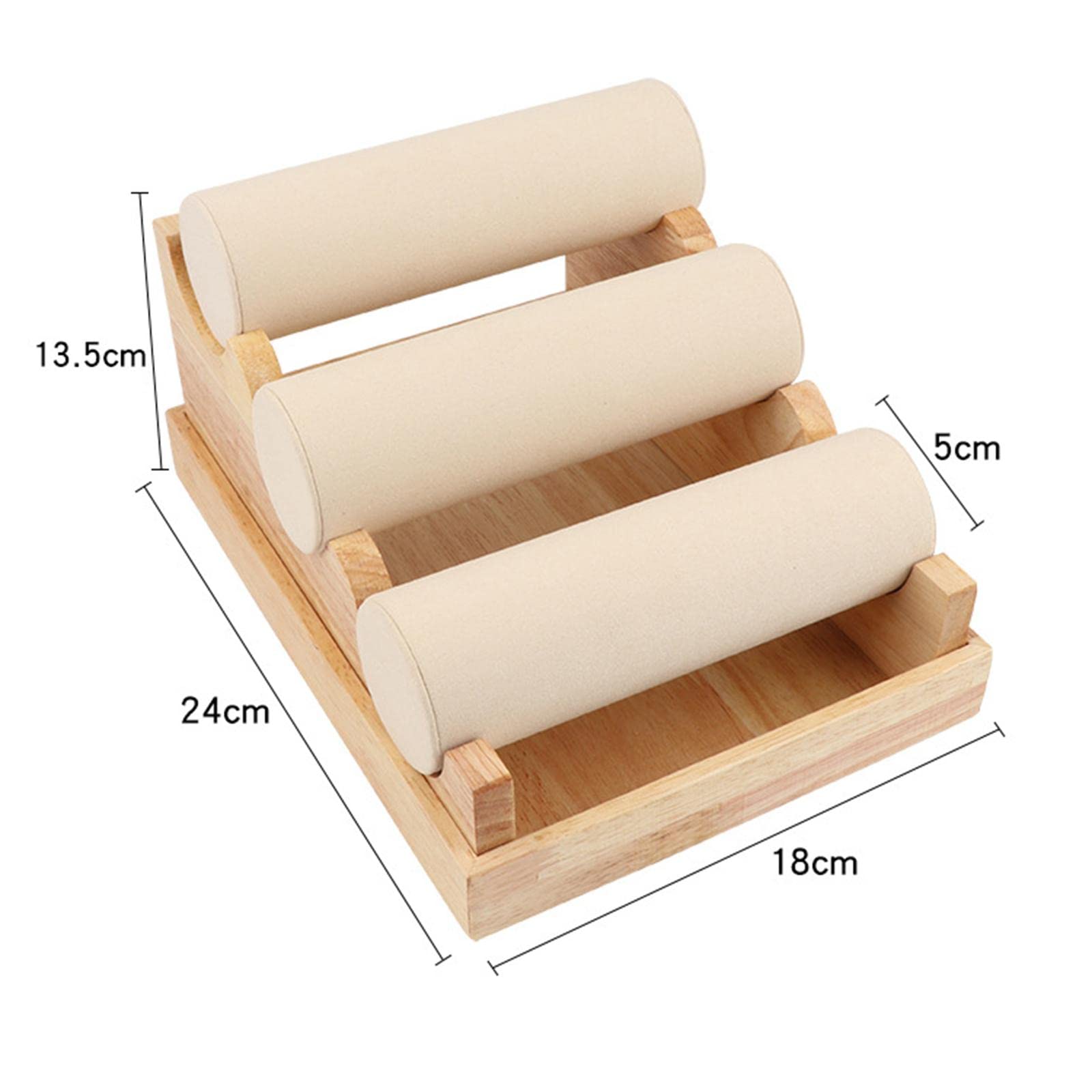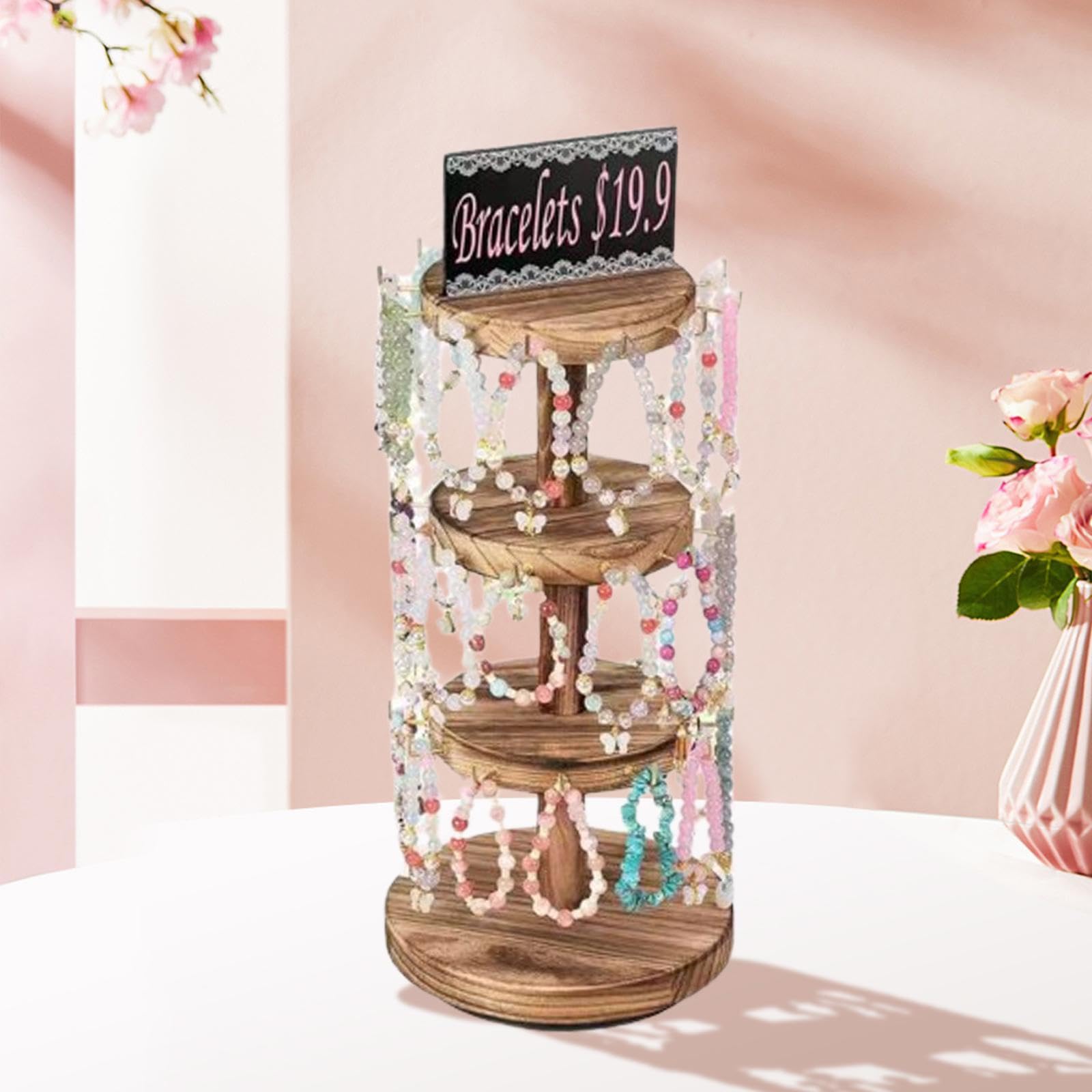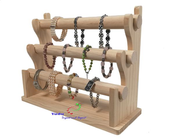 Deine Armbänder verdienen eine schöne Aufbewahrung! Dieser 3-stöckige Ständer aus Holz zeigt deinen Schmuck von seiner besten Seite und verhindert lästiges Verknoten.\n\nDas geniale Feature: Er dreht sich um 360 Grad! Du musst nicht mehr um den Ständer herumlaufen, um das richtige Armband zu finden - einfach drehen und alles im Blick haben.\n\nAus hochwertigem Holz gefertigt, das nicht nur gut aussieht, sondern auch ewig hält. Die Maße von 43 x 17,5 cm sind perfekt für die Kommode, den Schmucktisch oder das Badezimmer - nimmt nicht zu viel Platz weg.\n\nDrei Etagen bieten Platz für eine stattliche Sammlung. Ob dicke Armreifen, zarte Kettchen oder Fußbänder - alles hat seinen festen Platz. Endlich keine Sucherei mehr morgens!\n\nIm Lieferumfang ist sogar eine kleine Tafel enthalten, die du beschriften kannst. Super praktisch, wenn du verschiedene Kategorien hast oder den Ständer verschenken willst.\n\nDas Design ist zeitlos schön und passt in jedes Zimmer. Ob im Schlafzimmer, im Kleiderschrank oder sogar im Geschäft zur Präsentation - dieser Ständer macht überall eine gute Figur.\n\nEin absolutes Must-Have für alle, die ihre Armbänder lieben und sie nicht einfach in einer Kiste vergraben wollen. Dein Schmuck wird zum Blickfang - auch wenn du ihn gerade nicht trägst!