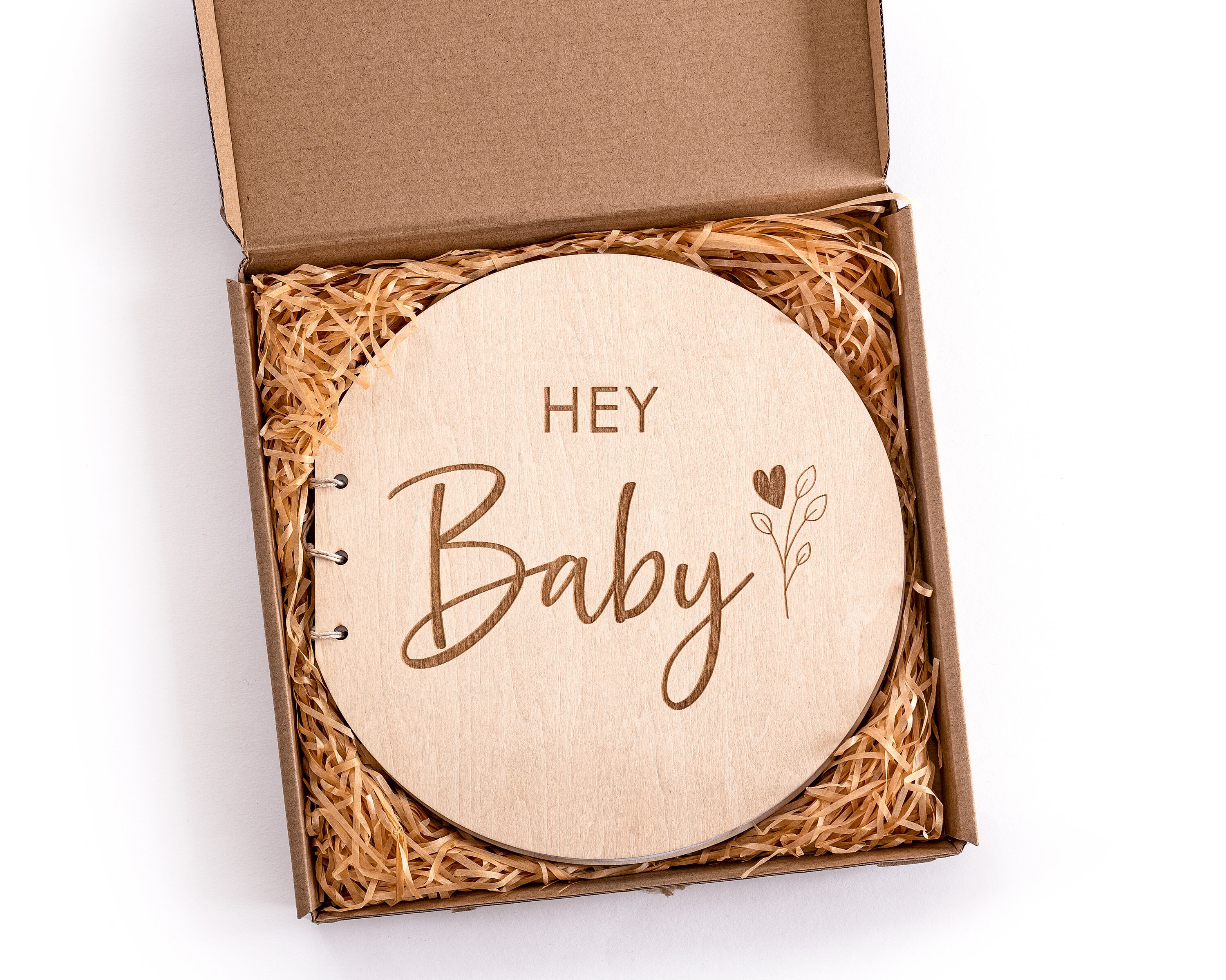 Der Deckel aus nachhaltigem Birkenholz mit dunkler Laser-Gravur 'Hey Baby' sieht wunderschön aus. Innen findest du 20 Seiten hochwertiges Kraftpapier – ideal für Fotos, Wünsche und Notizen. Gebunden mit natürlicher Baumwollschnur für langlebige Haltbarkeit.