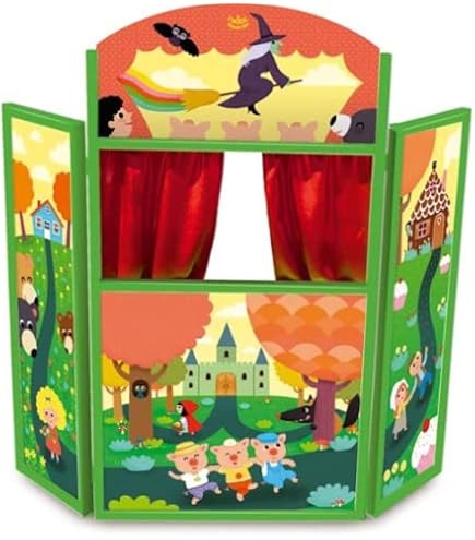 Hey, stell dir vor: Dein eigenes Kasperletheater! Dieses bunte Puppentheater aus Holz ist einfach der Hit für kleine Geschichtenerzähler. Die Besonderheit? Die Kulisse ist beidseitig bedruckt - mal zeigst du eine Stadtkulisse, mal ein Schloss im Wald. Einfach umdrehen und schon hast du eine neue Bühne! Die gelben Vorhänge links und rechts geben dem Ganzen noch mehr Theaterflair. Praktisch: Wenn die Vorstellung vorbei ist, klappst du einfach die Seitenwände an. Zack, ist das Theater nur noch 2 cm flach und passt super unter's Bett oder in eine schmale Ecke. Maße aufgeklappt: 120x66x31 cm - perfekt für kleine Puppenspieler. Übrigens: Das Theater fördert super die Kreativität und das Sozialverhalten deiner Kids. Wichtig: Stell es immer auf einen festen Untergrund, Teppich ist nicht so ideal. Ach ja, die Handpuppen sind natürlich nicht dabei - die suchst du dir separat aus. Perfekt für Jungs und Mädchen gleichermaßen!