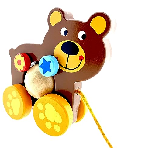 Was ich besonders niedlich finde: In den Rädern sind bunte Perlen, die beim Ziehen ein sanftes Klackern machen. Das fasziniert die Kinder total und motiviert sie, sich zu bewegen. Das Schweinchen ist übrigens handbemalt mit hellrosa Punkten - sieht einfach urig aus!