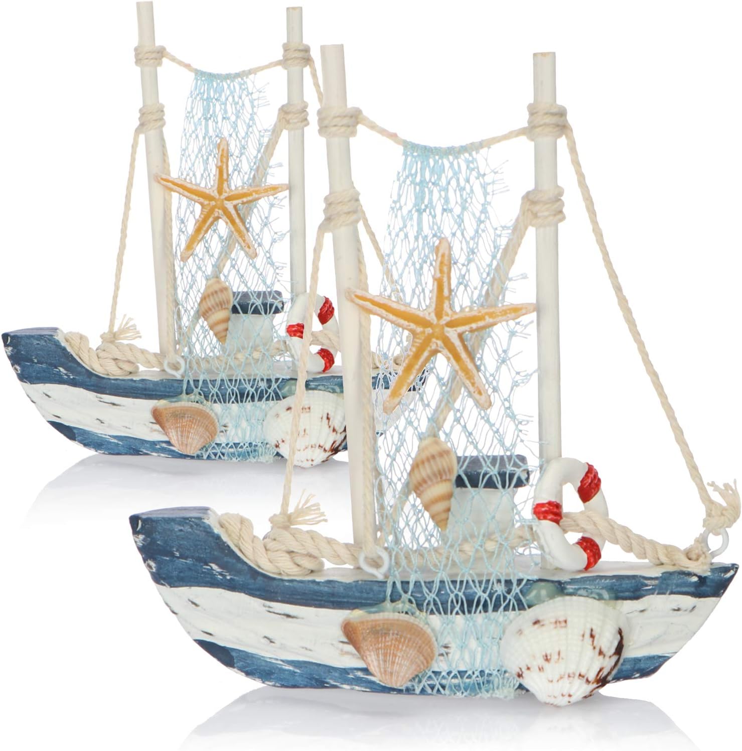 Wie niedlich ist denn dieses Holz-Segelschiff! Perfekt für alle die den maritimen Stil lieben. Mit Fischernetz, Anker, Muscheln und Seesternen dekoriert - sieht aus wie direkt vom Meer mitgebracht. Ca. 14cm hoch - also genau die richtige Größe für Regal, Schreibtisch oder Badezimmer.\\n\\nAus lackiertem Holzlaminat handgefertigt - jedes Stück ein Unikat! In Blau- und Weißtönen gehalten passt es zu vielen Einrichtungsstilen. Ob fürs eigene Zuhause oder als Geschenk für Seefahrer-Fans - diese Deko bringt sofort Urlaubsfeeling ins Haus.\\n\\nEs gibt 8 verschiedene Varianten zur Auswahl - jedes Schiff hat andere Dekoelemente. Einfach hinstellen und sich über die maritime Atmosphäre freuen. Besonders süß im Badezimmer oder als Tischdekoration beim Essen. Einfach ein charmantes Accessoire für mehr Meeres-Flair!