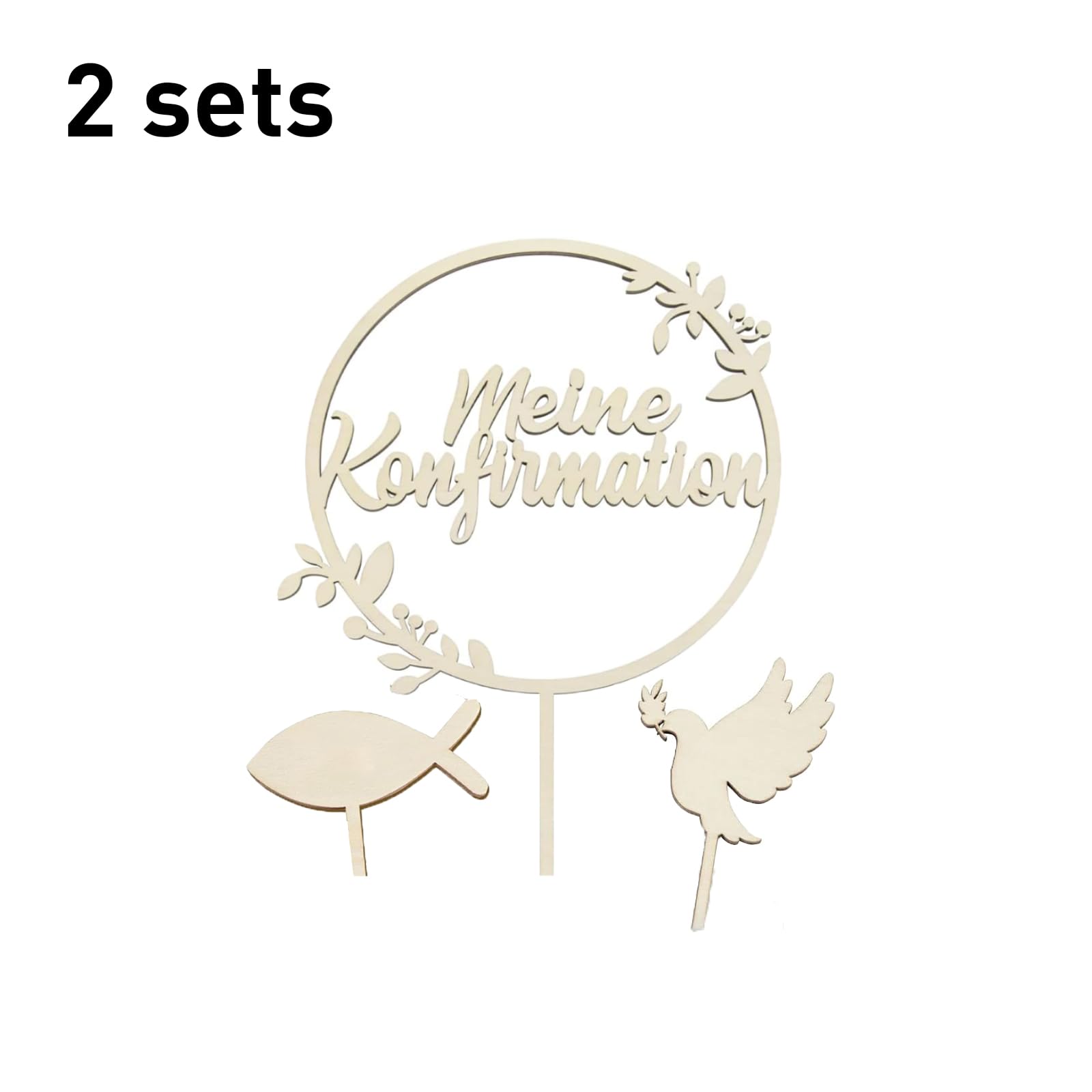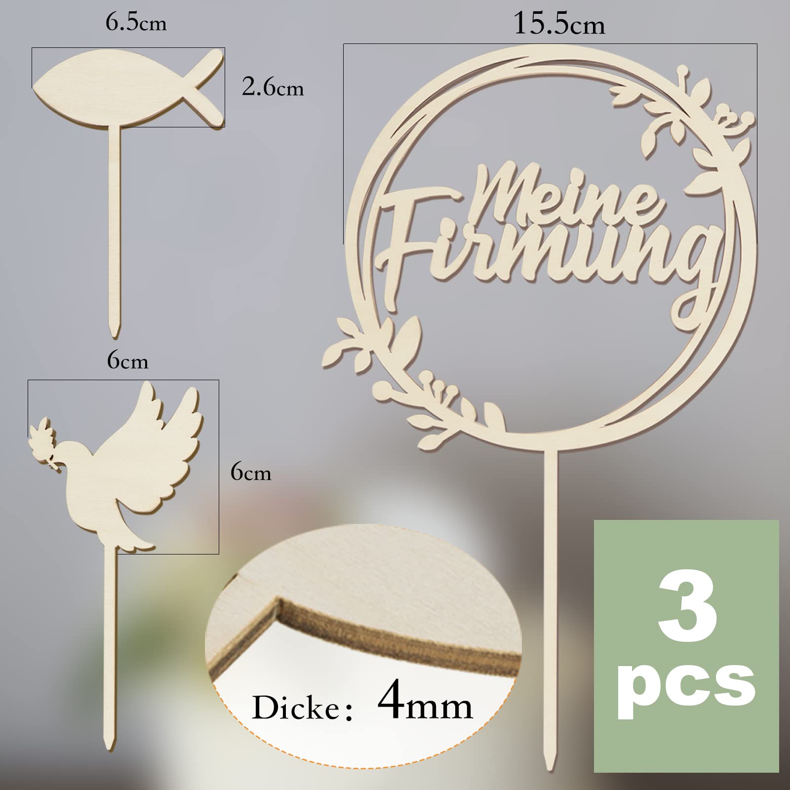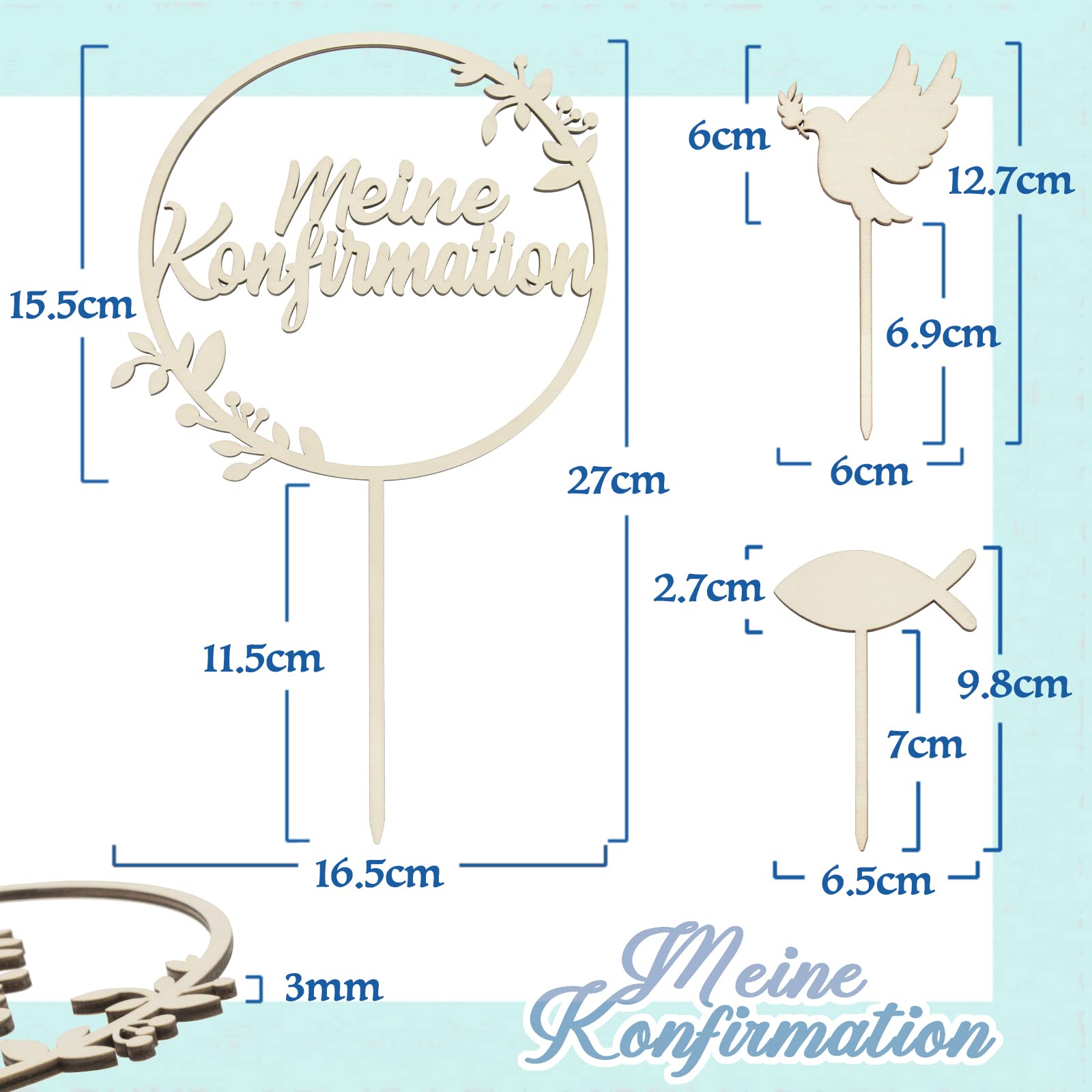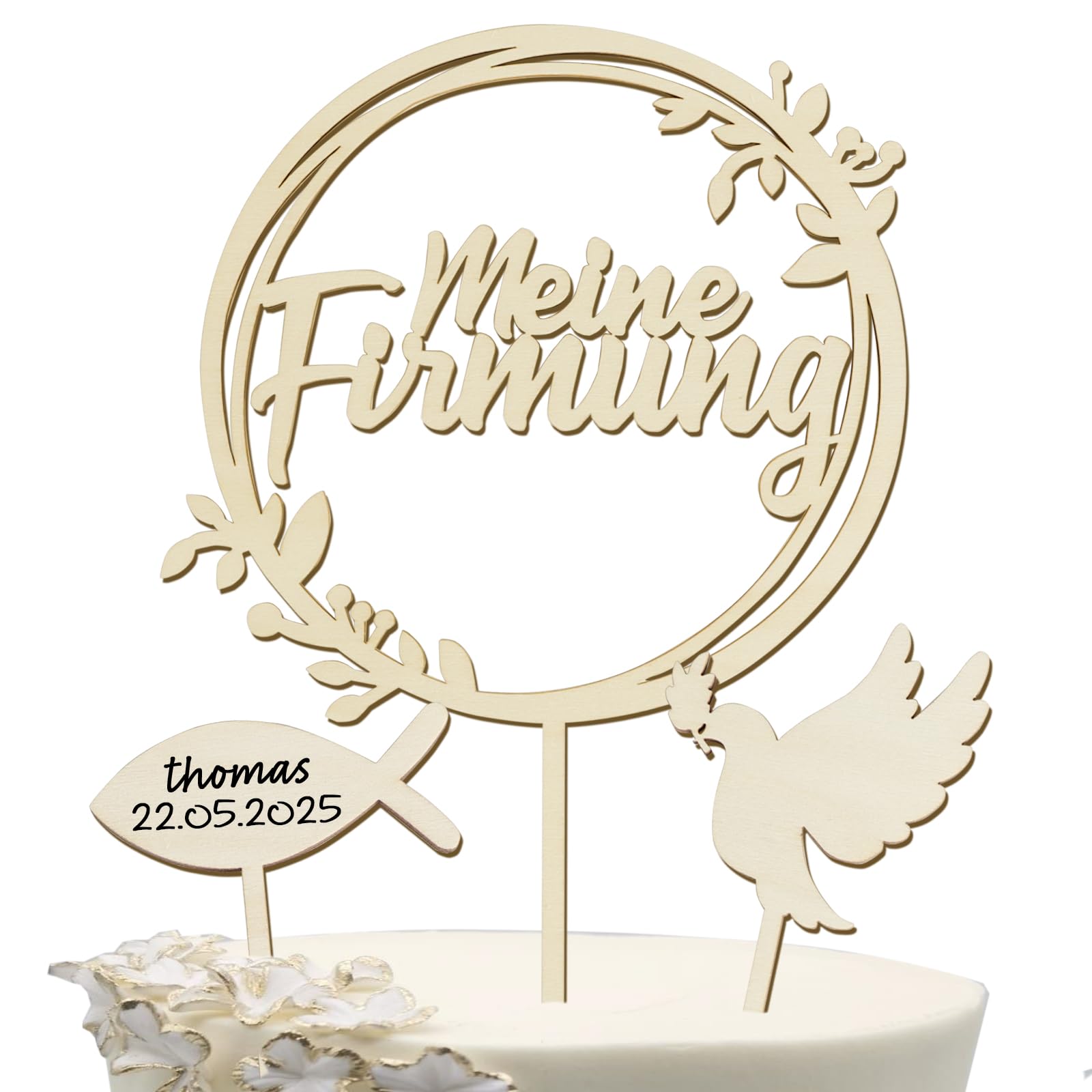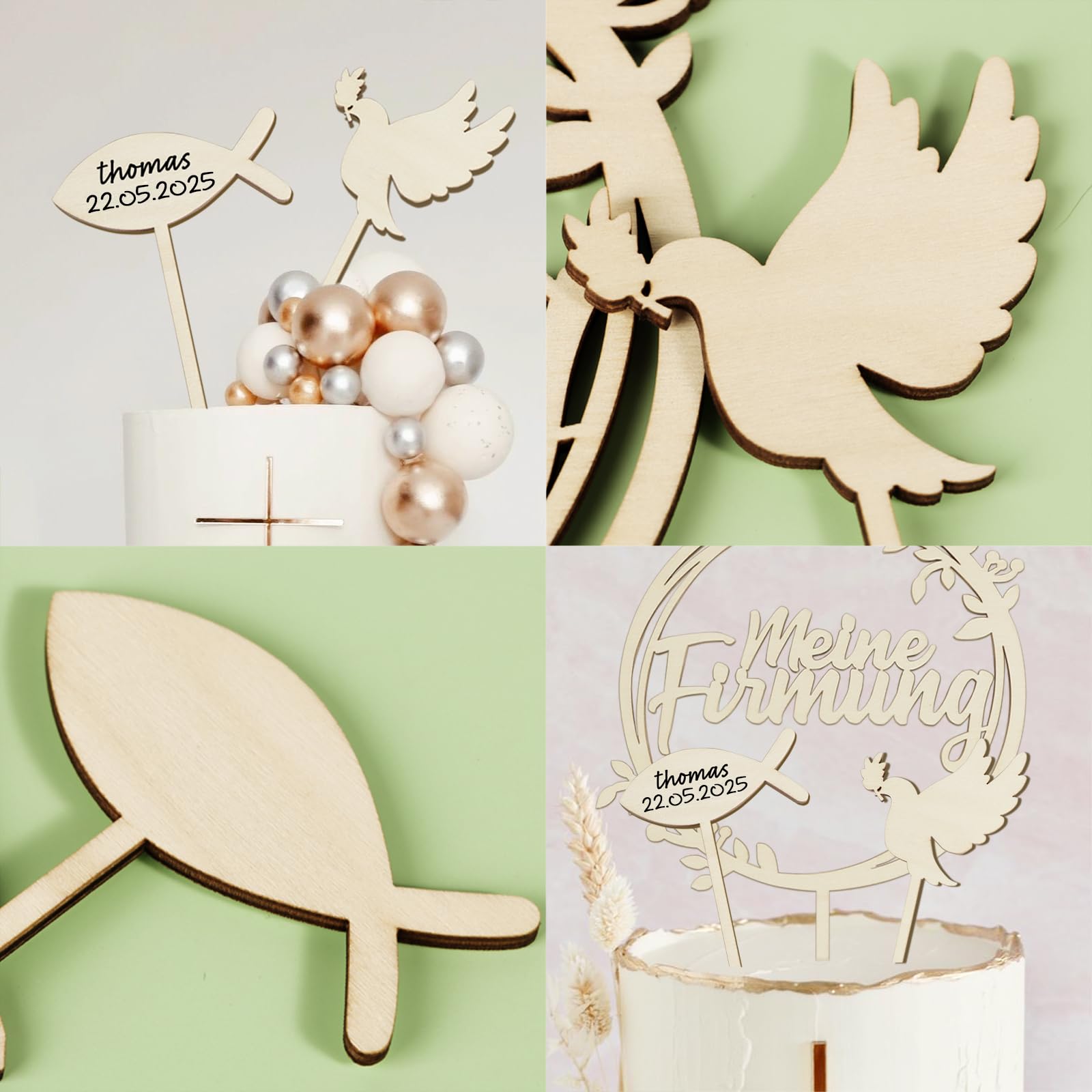 Planst du eine Konfirmation und suchst nach der perfekten Torten-Deko? Unser Set mit drei hölzernen Cake Toppern macht deine Konfirmationstorte zum absoluten Highlight! Enthalten sind: 1x 'Meine Konfirmation' Schriftzug, 1x süße Taube und 1x Fisch-Motiv. Die Deko-Stücke sind aus natürlichem Holz gefertigt - robust, umweltfreundlich und völlig geruchsneutral. Du kannst sie sogar mit Namen und Datum personalisieren für eine ganz besondere Erinnerung. Perfekt für die Feier der ersten heiligen Kommunion und Eucharistie, egal ob für Jungen oder Mädchen. Wichtig: Die Deko ist nur für dekorative Zwecke gedacht und nicht zum Verzehr geeignet! Bitte nicht in Backofen oder Mikrowelle verwenden. Die natürliche Holzfarbe verleiht deiner Torte einen festlichen und zugleich natürlichen Look. Ein wunderschöner Abschluss für deine Konfirmationstorte, der alle Gäste beeindrucken wird. Und das Beste: Die Topper sind wiederverwendbar - eine schöne Erinnerung an diesen besonderen Tag!