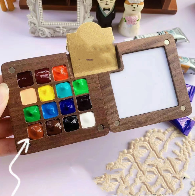 Kreativität überall und jederzeit! Dieses bezaubernde Mini-Aquarellset ist dein perfekter Begleiter für künstlerische Abenteuer unterwegs. Die wunderschöne Palette aus massivem Walnussholz mit magnetischem Verschluss (8x8 cm klein und handlich) hat 15 praktische Farbfächer und eine große Mischfläche auf der Rückseite. Im Lieferumfang findest du alles was du brauchst: die Holzpalette, ein Skizzenbuch mit 58 Blättern hochwertigem Aquarellpapier (beidseitig nutzbar), einen Metallclip zur Befestigung und einen Aquarellpinsel. Das Besondere: Dieses Set kommt OHNE Farben - du kannst es also ganz nach deinen Vorlieben mit deinen Lieblingsfarben befüllen. Perfekt für Urban Sketching, Reisen oder einfach mal schnell im Park. Alles passt bequem in jede Handtasche oder Rucksack. Die magnetische Verschluss sorgt dafür, dass auch unterwegs nichts ausläuft. Tipp: Nach dem Malen einfach mit einem feuchten Tuch abwischen - aber nicht ins Wasser legen, sonst verzieht sich das Holz. Ob du Anfänger oder Profi bist - dieses Set gibt dir die Freiheit, überall und jederzeit deiner Kreativität freien Lauf zu lassen. Ein ideales Geschenk für alle, die die Welt mit künstlerischen Augen sehen!