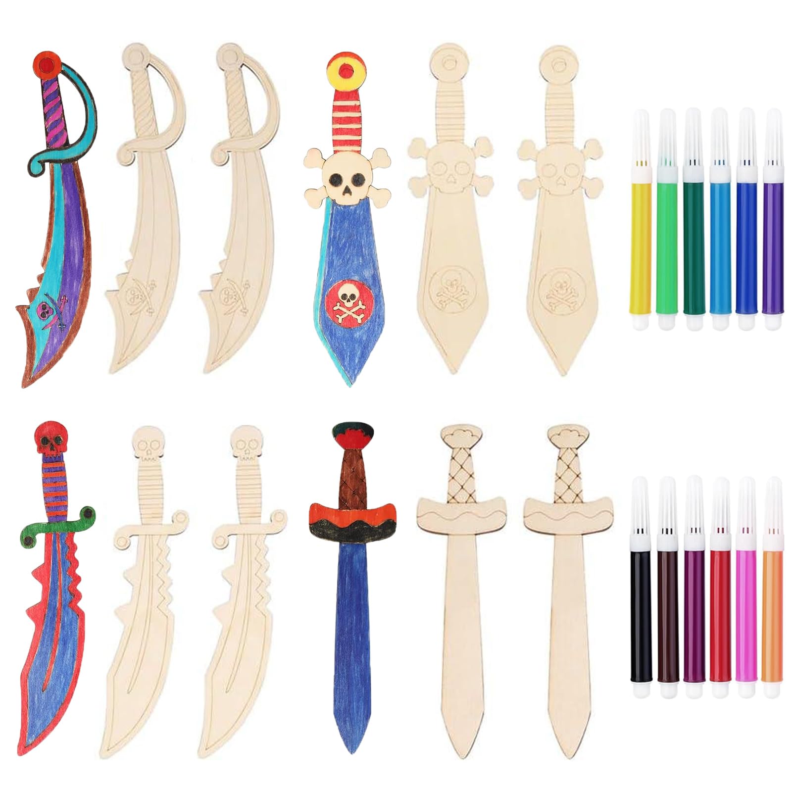 Ahoy, kleine Piraten! Dieses mega coole Set mit 24 Teilen bringt jede Kinderparty zum Strahlen. Enthalten sind 12 Holzschwerter aus stabilem Buchenholz und 12 ungiftige Wasserfarbstifte - alles, was kleine Künstler brauchen, um ihre eigenen Piratenschwerter zu gestalten. Die Schwerter sind super sicher und perfekt für kleine Hände. Einfach die Stifte rausholen und der Kreativität freien Lauf lassen - die Farben trocknen schnell, sodass die Kunstwerke sofort bewundert werden können. Perfekt als Aktivität auf dem Kindergeburtstag, als Tischdekoration oder als Gastgeschenk. So förderst du spielerisch die Feinmotorik und Kreativität der Kinder, während sie in aufregende Piratenabenteuer eintauchen. Einfach auspacken, losmalen und schon haben die kleinen Piraten ihre eigenen Schätze! Ein Geschenk, das garantiert begeistert.