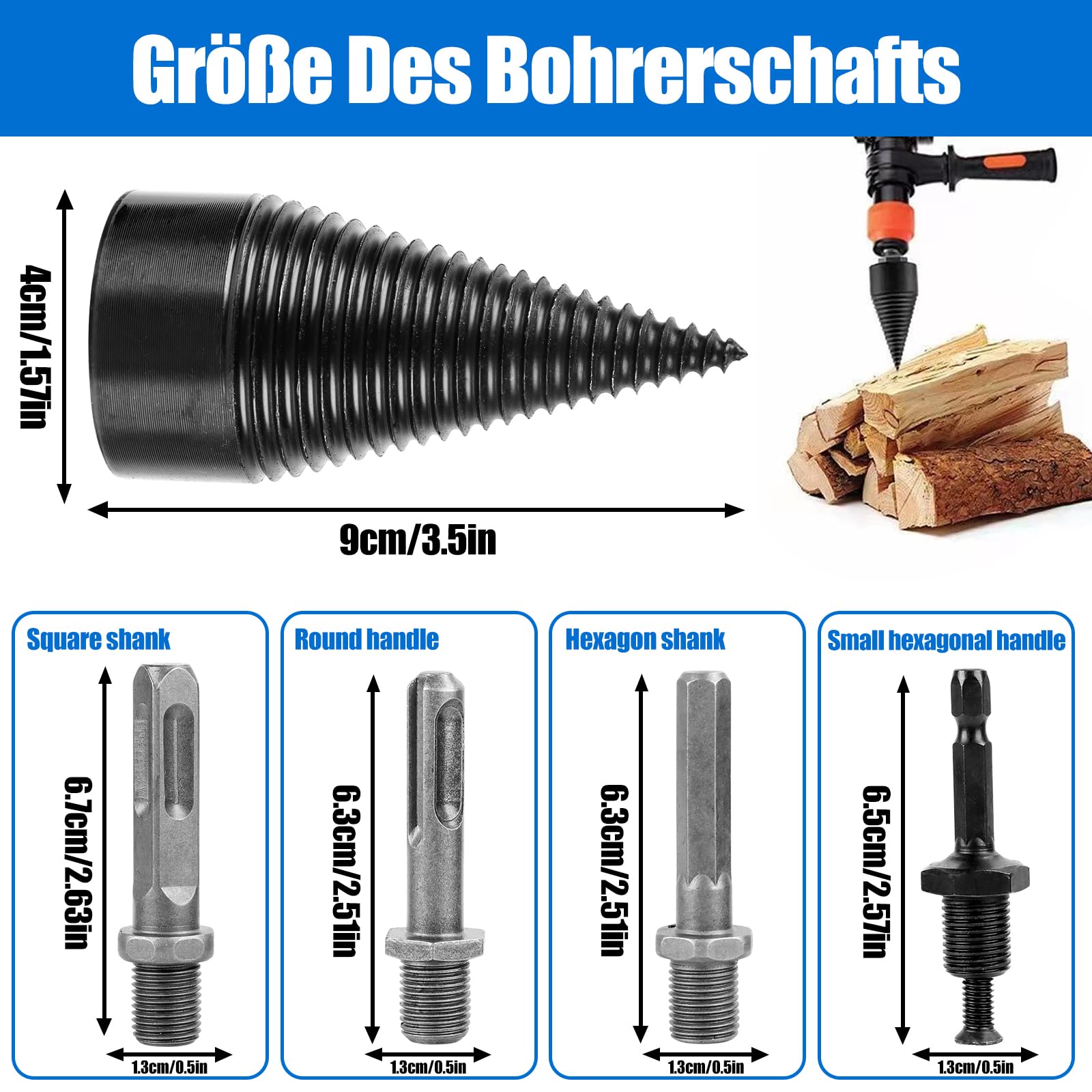 Mann, dieser Holzspalter-Bohrer macht Brennholz machen sooo viel einfacher! Einfach an deine Bohrmaschine anschrauben und schon kannst du mühelos Holz spalten. Der 42 mm große Kegel aus Kohlenstoffstahl ist super scharf und durchdringt selbst hartes Holz problemlos. Mit 3 verschiedenen Griffen im Set - Vierkant, Rund und Sechskant - passt er an fast jede Maschine. Das tiefe Gewinde erhöht die Reibung und zieht sich quasi von selbst durch das Holz. Die Anti-Rutsch-Rillen verhindern das Abrutschen und erhöhen die Effizienz. Perfekt für Eiche, Walnuss und andere Harthölzer - aber bitte nicht in der Mitte des Stammes ansetzen! Ideal für zu Hause, Camping oder Bauernhof - wo immer du Brennholz benötigst. Ohne scharfe Klinge auch sicherer für Haushalte mit Kindern. Einfach genial für alle, die regelmäßig Holz machen - spart Zeit, Kraft und Nerven. Hol dir diesen praktischen Helfer und mach das Holzspalten zur leichten Übung!