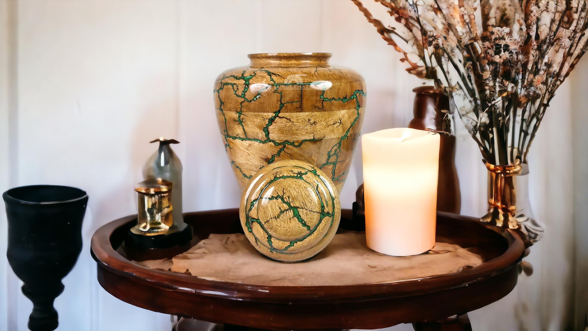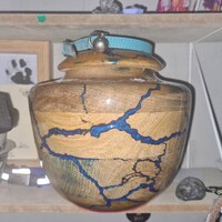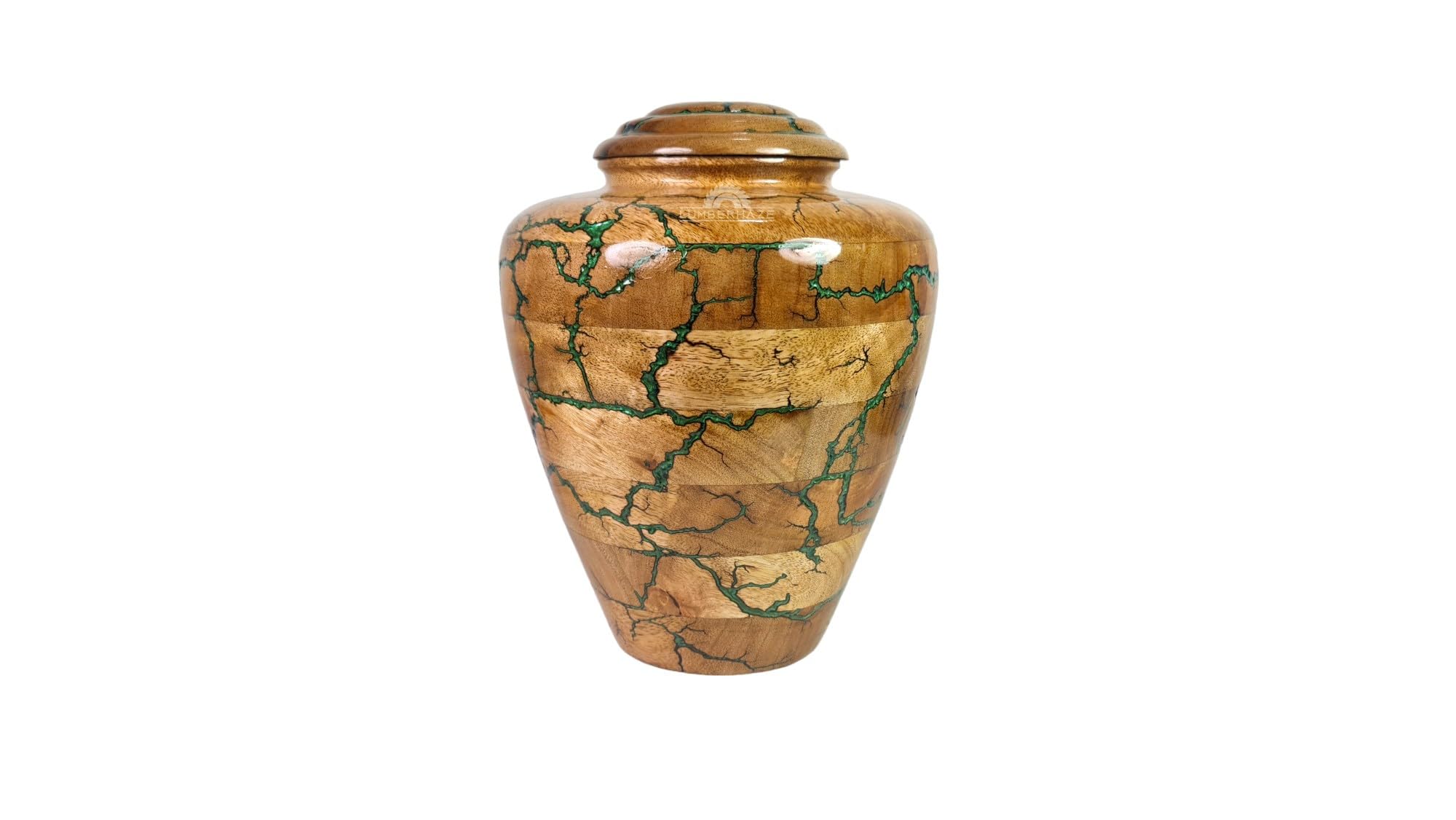 Eine würdige und schöne Art, Erinnerungen zu bewahren. Diese Urne wird in Indien von erfahrenen Handwerkern aus massivem Holz gefertigt - jedes Stück ein Unikat! Das besondere Fractal-Brenndesign gibt ihr eine einzigartige Optik. In Grün erhältlich (und anderen Farben) mit einer schönen glänzenden Oberfläche. Der Deckel schließt sicher, damit der Inhalt geschützt bleibt. In verschiedenen Größen erhältlich - hier die große Version mit 200 cu Kapazität. Leicht zu tragen und an jedem Ort aufzustellen. Eine wirklich besondere Art, liebe Menschen in Erinnerung zu behalten.