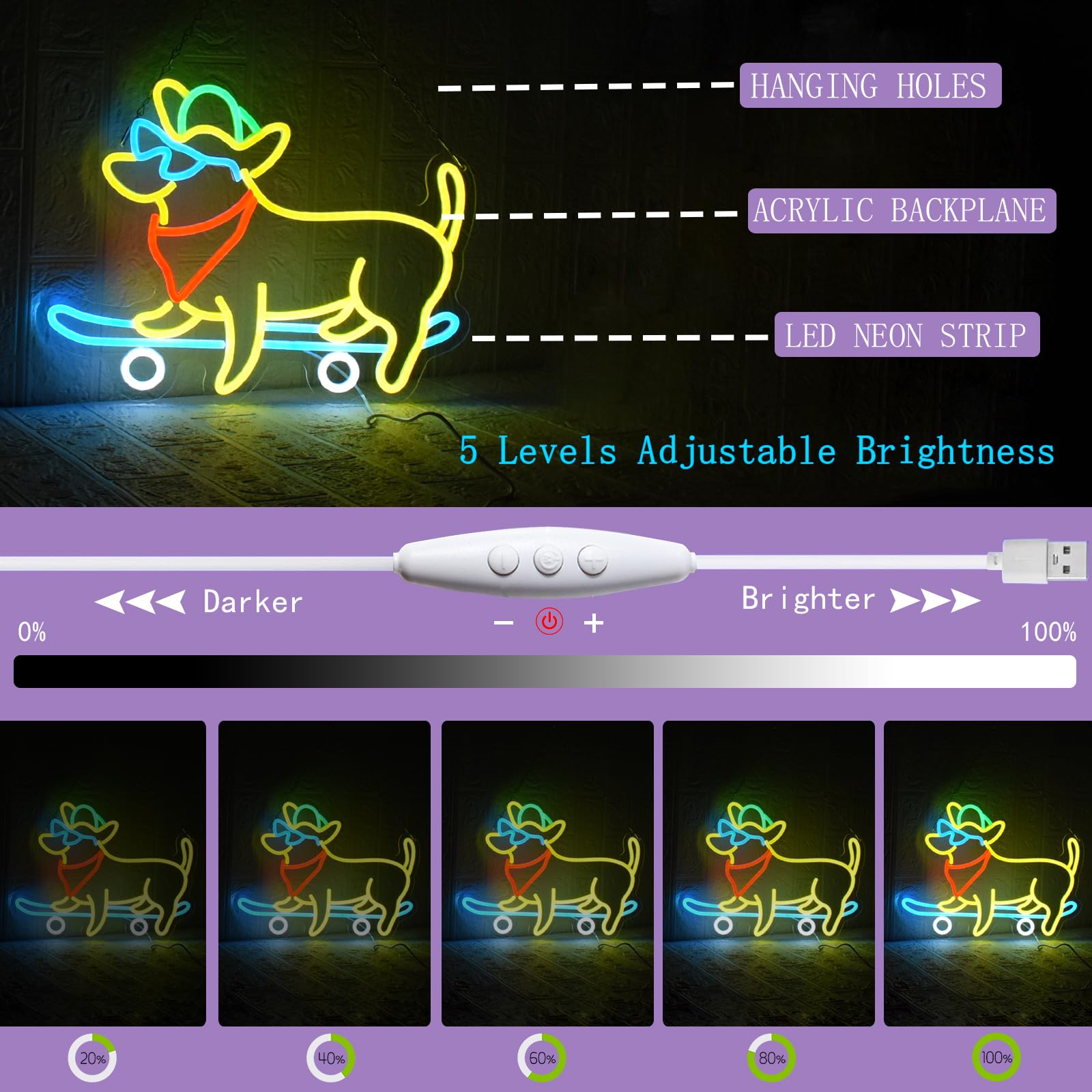 Boah, wie cool ist denn dieses Neonschild! Ein Skateboard fahrender Dackel - wer will das nicht? Mit 33x34cm Größe ist es genau richtig für deine Wand. Aus hochwertigem Silikon-LED-Streifen und Acryl - sieht aus wie ein echtes Neon, aber sicherer und energiesparender. Das geniale Feature: Es ist dimmbar! Du kannst die Helligkeit ganz nach Stimmung einstellen - von gemütlichem Nachtlicht bis knallhell. Einfach per Knopf am Kabel - kein Stecker nötig! Mit USB-Anschluss - anschließen an PC, Powerbank oder USB-Adapter und schon leuchtet's. Komplett mit Aufhängedraht und Haken - in wenigen Minuten an der Wand. Perfekt fürs Schlafzimmer, Bar, Café oder Surf-Shop. Ein super Geschenk für Hundeliebhaber und Surf-Fans! Ob für Geburtstage, Weihnachten oder einfach so - dieses Neonschild kommt immer gut an. Schafft sofort coole Atmosphäre und ist ein echter Hingucker. Einfach aufhängen, anschließen und den coolen Surf-Hund genießen!