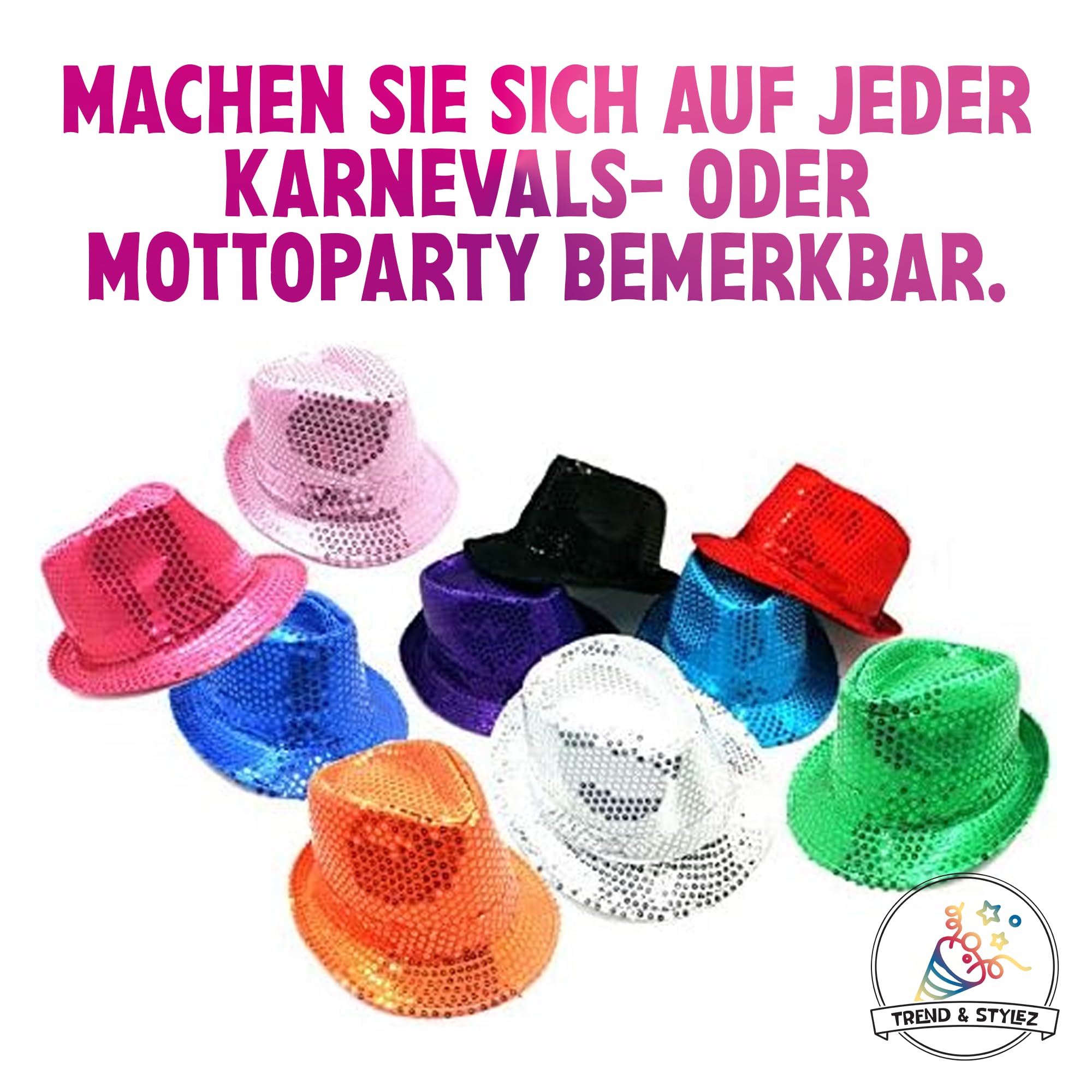 Karnevalsfans und Partygänger, dieser Pailletten Hut ist der absolute Hingucker! 57 cm Durchmesser - Einheitsgröße die den meisten Erwachsenen und Jugendlichen ab 15 Jahren passt. Verfügbar in vielen Farben: Gold, Silber, Rot, Pink, Blau, Grün, Weiß, Orange, Bunt oder mit Sternen - für jeden Geschmack was dabei! Die Pailletten sind fest vernäht - nichts fällt ab, auch nicht bei langen Partynächten! Im Retro-Stil des Trilby-Hutes geschnitten - total modisch und zeitlos. Aus angenehmem, elastischem Stoff - nicht zu schwer und passt sich dem Kopf an. Perfekt für Karneval, Fasching, Mottopartys, Silvester oder Bühnenauftritte. Auch für Gruppen, Vereine und Events super - einheitlicher Look garantiert! Kombinierbar mit vielen Kostümen - ob Disco, Glamour oder Clown. Mach deine Party unvergesslich mit diesem funkelnden Hut!