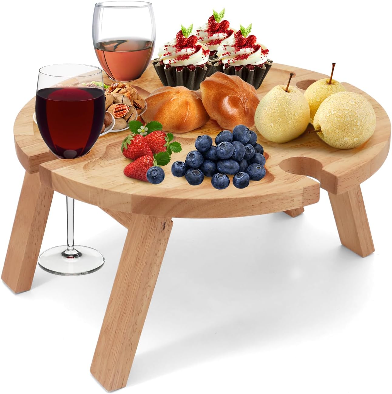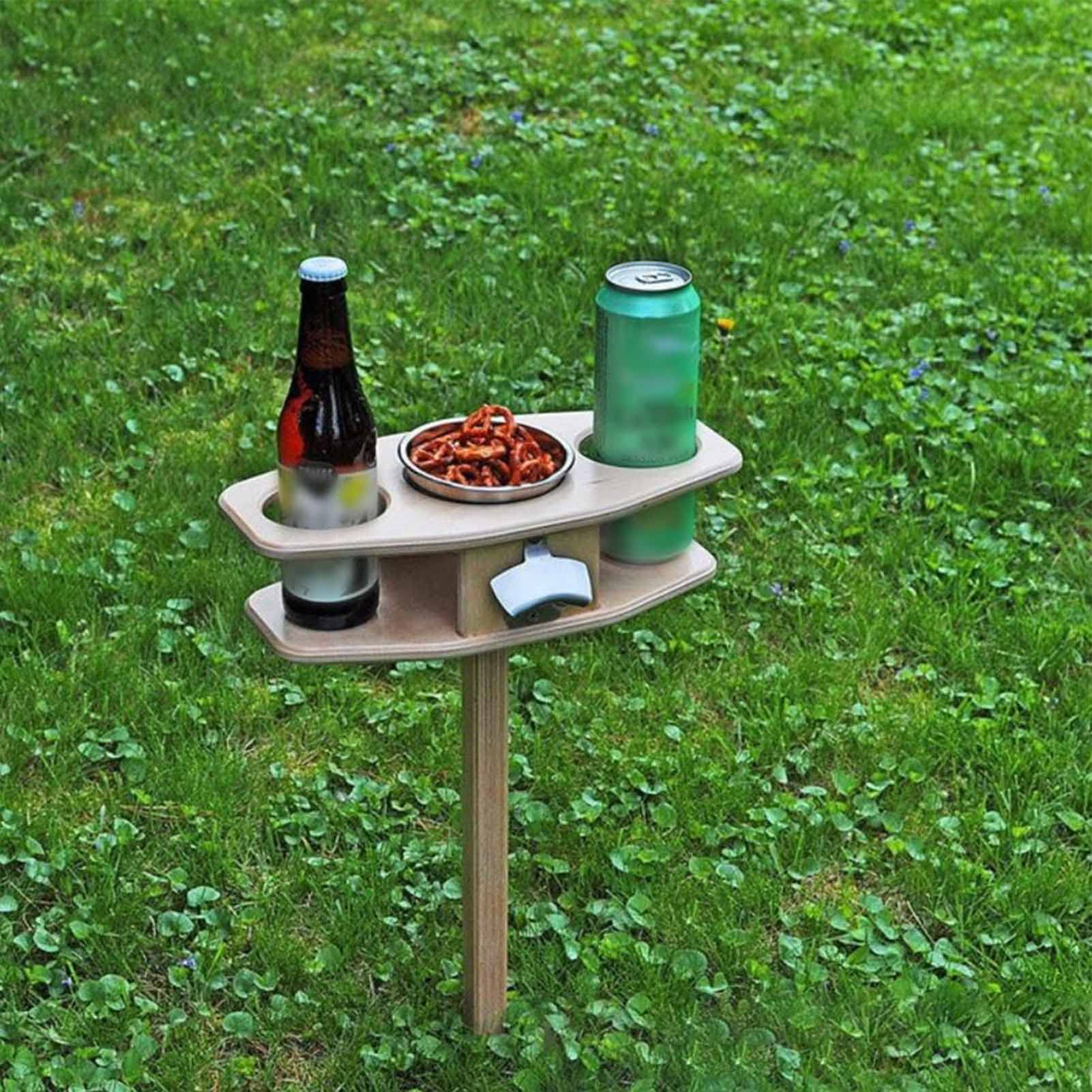 Genial praktisch für alle Outdoor-Fans! Dieser klappbare Weintisch von Hyxodjy ist der perfekte Begleiter für Picknicks, Camping-Ausflüge oder gemütliche Stunden im Park. Aus hochwertigem Holz gefertigt, fühlt sich nicht nur natürlich an, sondern ist auch super stabil. Das zweistöckige Design ist einfach clever: Obst platzierst du bequem zwei Bierflaschen oder Weingläser, während unten dein Smartphone und ein Teller mit Snacks Platz finden. Mit nur 40cm Höhe (30cm bei Nutzung) und 20cm Durchmesser ist er kompakt, aber groß genug für alles Nötige. Die spitzen Füße lassen sich leicht in weichen Boden wie Wiese oder Strand stecken - kein lästiges Umkippen mehr! Und das Beste: Er klappt komplett zusammen und ist damit super leicht zu transportieren und platzsparend zu verstauen. Hält bis zu 1,6 kg aus - perfekt für dein Bier, Wein und kleine Snacks. Einfach aufstellen, genießen und den Moment auskosten - ob beim Festival, im Garten oder am See!