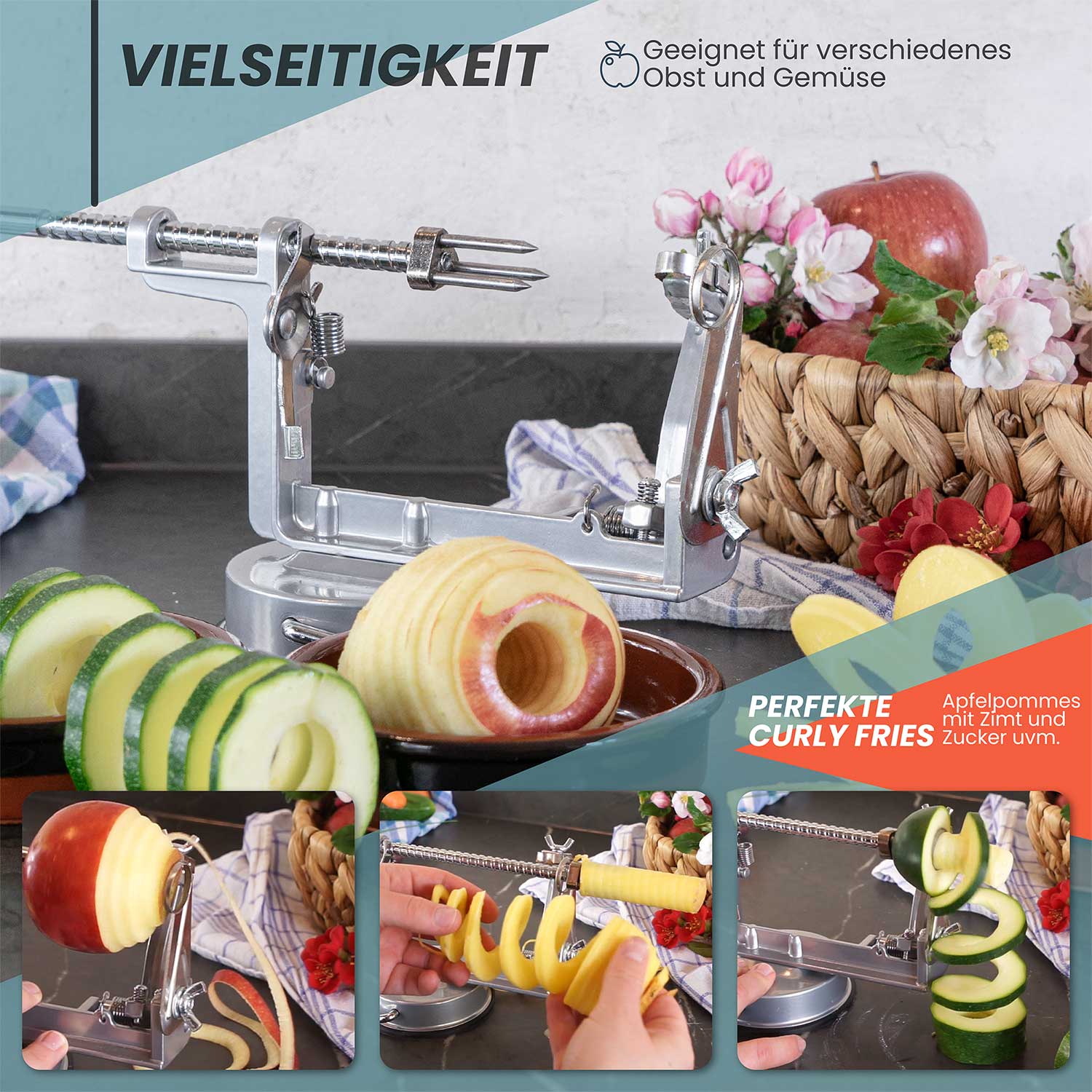 Wer liebt sie nicht - knackige Äpfel! Aber das Schälen und Entkernen kann echt nerven. Mit diesem ICO Profi-Apfelschäler wird's zum Kinderspiel! Einfach Apfel auf die Gabel stecken, Kurbel drehen und zack - hast du einen perfekt geschälten, entkernten und spiralförmig geschnittenen Apfel. Das Beste: Die Maschine ist aus robustem Metall und steht bombenfest dank Vakuum-Fuß. Die Klinge ist aus Edelstahl 18/10 und lässt sich sogar individuell einstellen. Und wenn du das innere Schneidemesser abnimmst, kannst du damit auch Kartoffeln, Karotten und anderes Gemüse schälen! Super praktisch für Apfelkuchen, Obstsalat oder einfach als gesunden Snack. Die Apfelschale musst du übrigens nicht wegwerfen - daraus kannst du leckeren Apfeltee machen! Mit dunkelbrauner Hartholzkurbel und schwarzem Silikon-Saugnapf sieht die Maschine auch noch richtig stylisch aus. Einfach zu reinigen und mit Bedienungsanleitung in vier Sprachen. Endlich macht Apfelschälen Spaß!