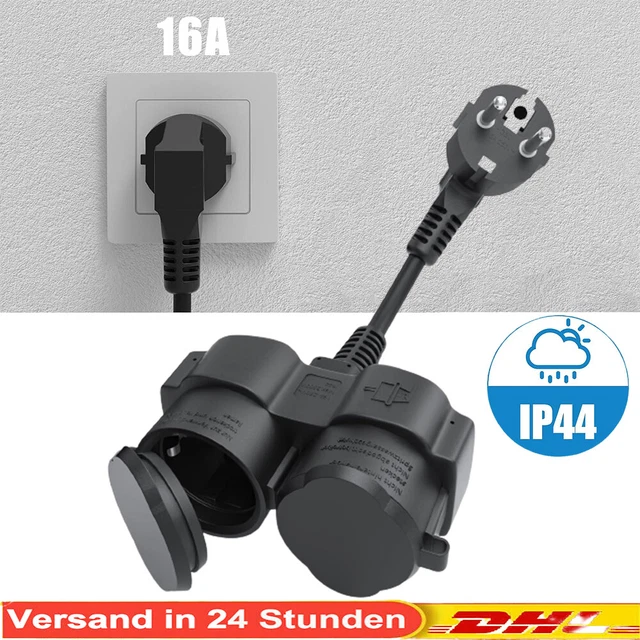Endlich eine Steckdose, die auch draußen funktioniert! Dieser 2-fach Steckdosenverteiler hat IP44 Schutz - also absolut wasser- und spritzwassergeschützt. Perfekt für Garten, Terrasse, Balkon oder auch in feuchten Innenräumen wie Küche und Bad. Bis zu 3500W Leistung, also auch für stärkere Geräte geeignet. Das kurze 7,5 cm Kabel ist praktisch für enge Platzverhältnisse. Aus feuerfestem PC-Material mit Gummiabdeckung - sicher und langlebig. Einfach einstecken und du hast zwei zusätzliche Steckdosen, die sich nicht gegenseitig stören. Praktisch und sicher!