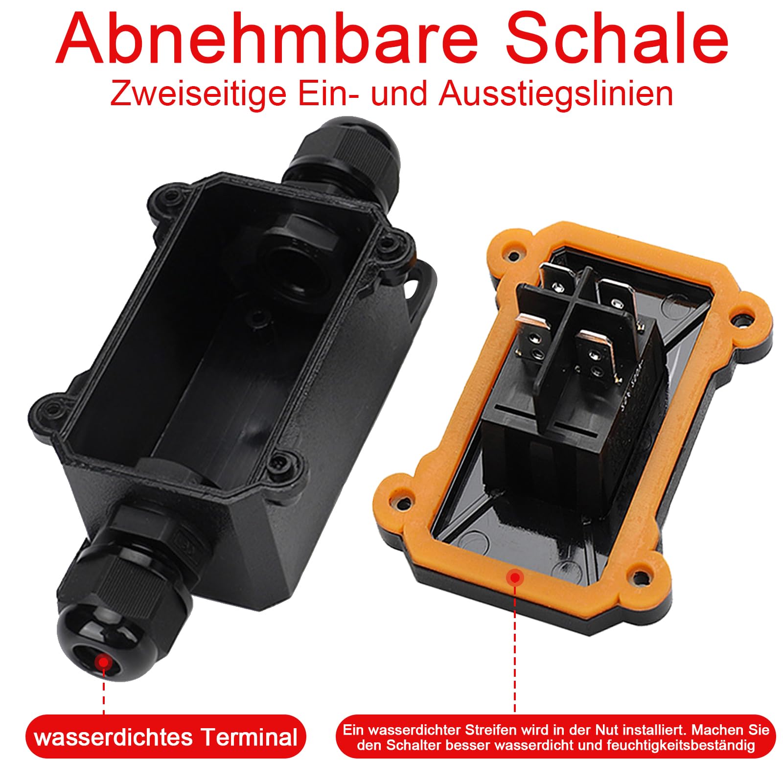 Handwerker und Heimwerker, dieser wasserdichte Schalter ist ein echter Alleskönner! Mit IP67 Schutz ist er komplett staub- und wassergeschützt - perfekt für den Einsatz im Freien oder in feuchten Umgebungen. Der DPST 4-polige Schalter mit 20A bei 250V AC packt richtig was weg! Das rote LED-Licht zeigt dir sofort, ob der Schalter ein- oder ausgeschaltet ist. Super einfach zu montieren - einfach in die Leitung klemmen und fertig! Ob für deine Werkstattmaschinen, industrielle Anlagen oder Outdoor-Projekte - dieser Schalter hält was aus. Das ABS-Material ist korrosionsbeständig und die Messing-Kontakte sorgen für perfekte Leitfähigkeit. Einfach, robust und zuverlässig - genau das, was man sich von einem Schalter wünscht!
