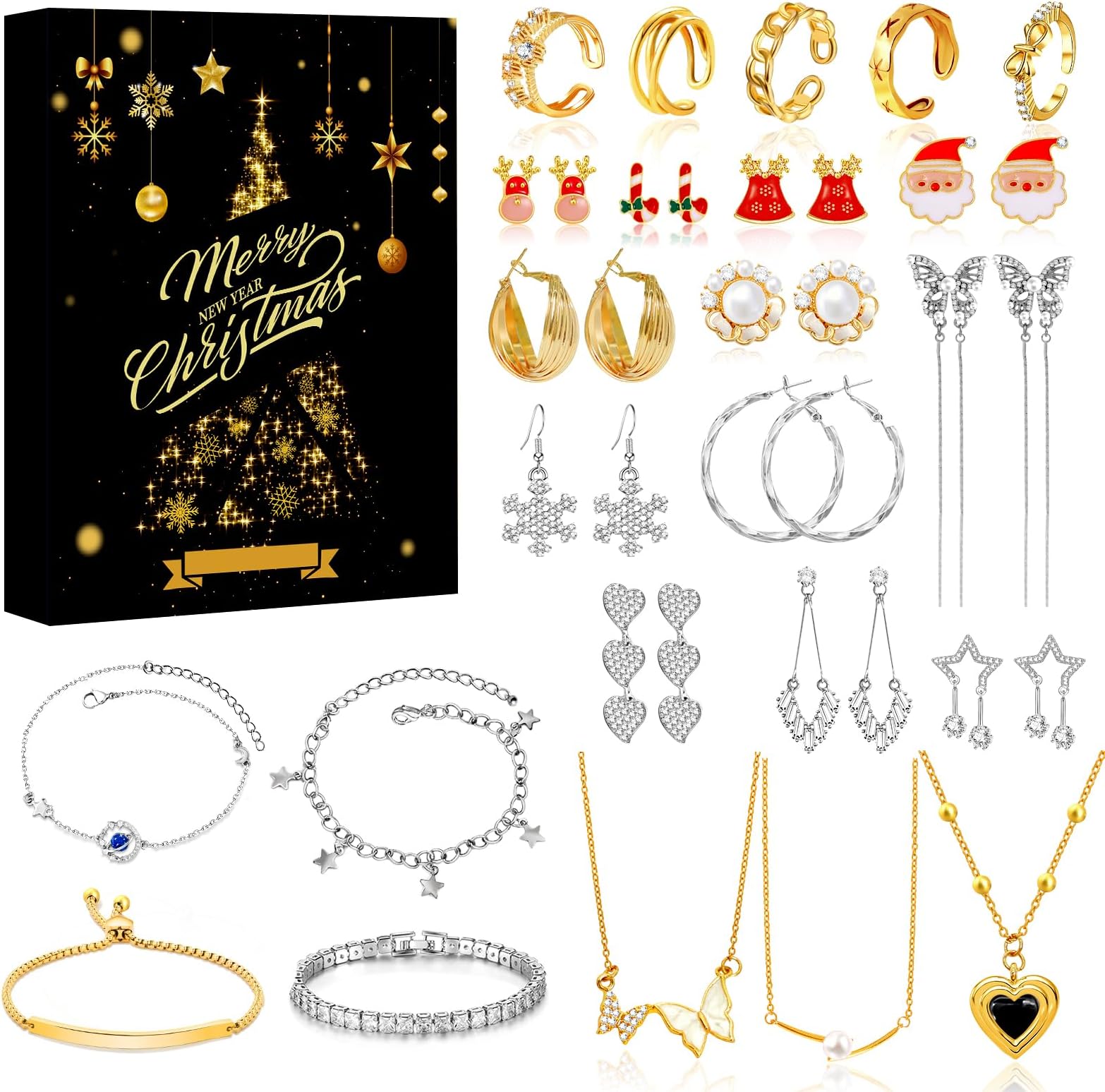 Wow, was für eine geniale Idee für die Weihnachtszeit! Dieser Adventskalender ist perfekt für alle Schmuckliebhaberinnen. Statt Schokolade gibt's hier 24 Tage lang echten Schmuck - wie cool ist das denn?\n\nHinter den 24 Türchen verstecken sich total vielfältige Schmuckstücke: 1 Halskette, 21 Charms, 1 Paar Ohrringe, 1 Ring und 2 Armbänder, die du nach Belieben kombinieren kannst. Das Beste: Die Armbänder sind 22cm lang und damit für die meisten Damen und Teenager-Mädchen perfekt geeignet.\n\nDie Stücke kommen in Gold, Silber und Rot daher und haben verschiedene Styles - von weihnachtlich über vintage bis modern. So kann man je nach Laune und Anlass immer was Passendes finden.\n\nOb für die Freundin, Ehefrau, Mutter, Tochter oder Nichte - dieser Kalender bringt 24 Tage lang Freude und Vorfreude auf Weihnachten. Jeden Tag ein neues Schmuckstück, das man sofort tragen oder mit den anderen Teilen kombinieren kann.\n\nMaße: 22cm x 29cm\nIdeal für: Schmuckfans ab Teenageralter, Weihnachtsgeschenk-Sucher, alle die Abwechslung lieben!