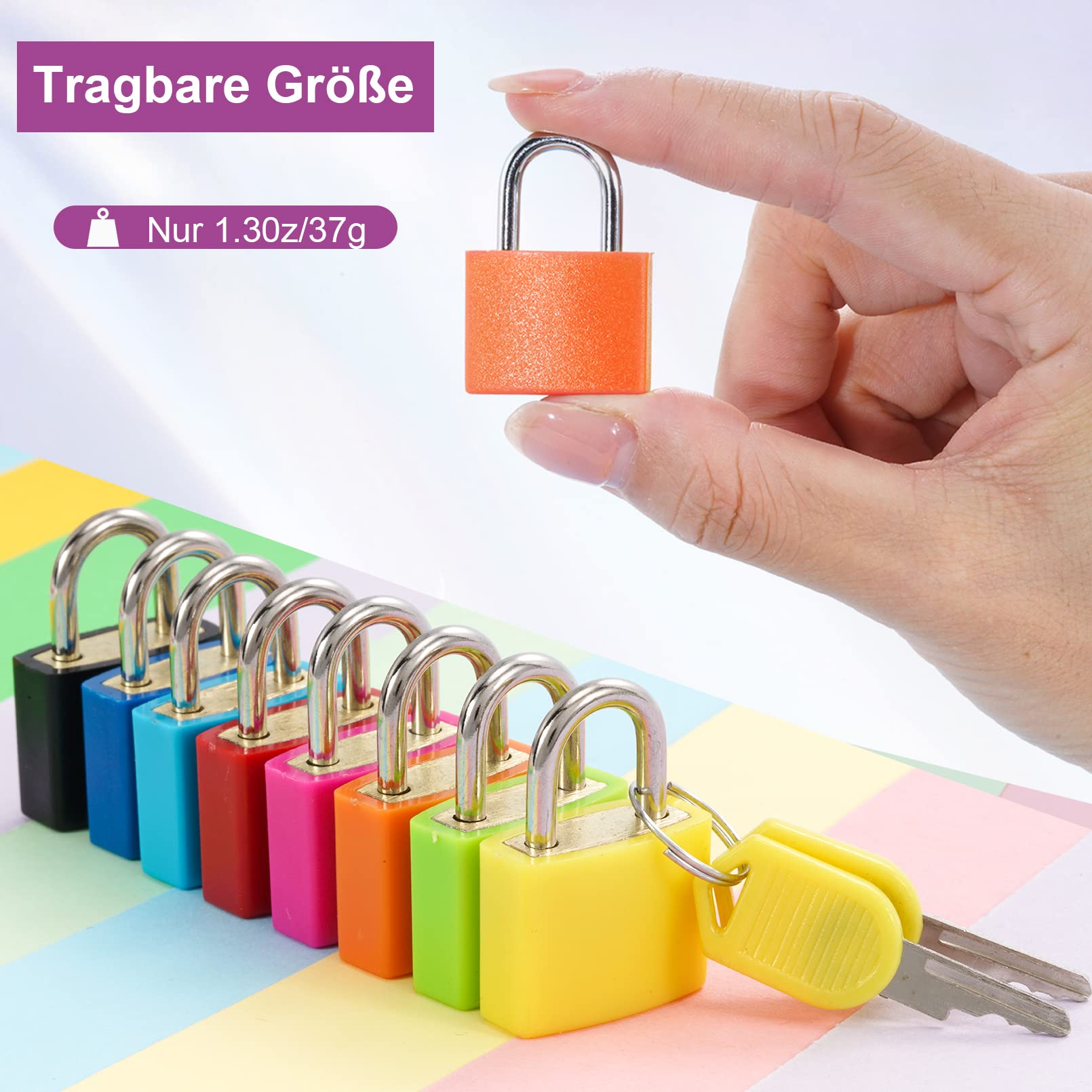 Wow! 16 bunte Vorhängeschlösser in einem Set - damit machst du nichts falsch! Super praktisch für Reisen, Schule oder einfach zu Hause. \\n\\nJedes Schloss hat einen robusten Kern aus Zinklegierung und eine bunte Kunststoffhülle. Die gibt's in 8 verschiedenen Farben: Rosenrot, Schwarz, Blau, Rot, Orange, Gelb, Grün und Himmelblau - so erkennst du dein Gepäck sofort! \\n\\Klein aber oho: Nur 23mm groß, aber mit hoher Sicherheit. Jedes Schloss wird mit 2 Schlüsseln in der gleichen Farbe geliefert - kein lästiges Passwort merken! \\n\\nEinsatzmöglichkeiten ohne Ende: \\n- Koffer und Reisetaschen \\n- Schließfächer in der Schule \\n- Werkzeugkisten \\n- Spinde \\n- Tagebücher \\n- Fahrradkörbe \\n\\nWasserdicht, rostbeständig und langlebig. Das Set ist perfekt für Familien - jeder bekommt seine eigene Farbe. Nie wieder Schlüssel verwechseln!