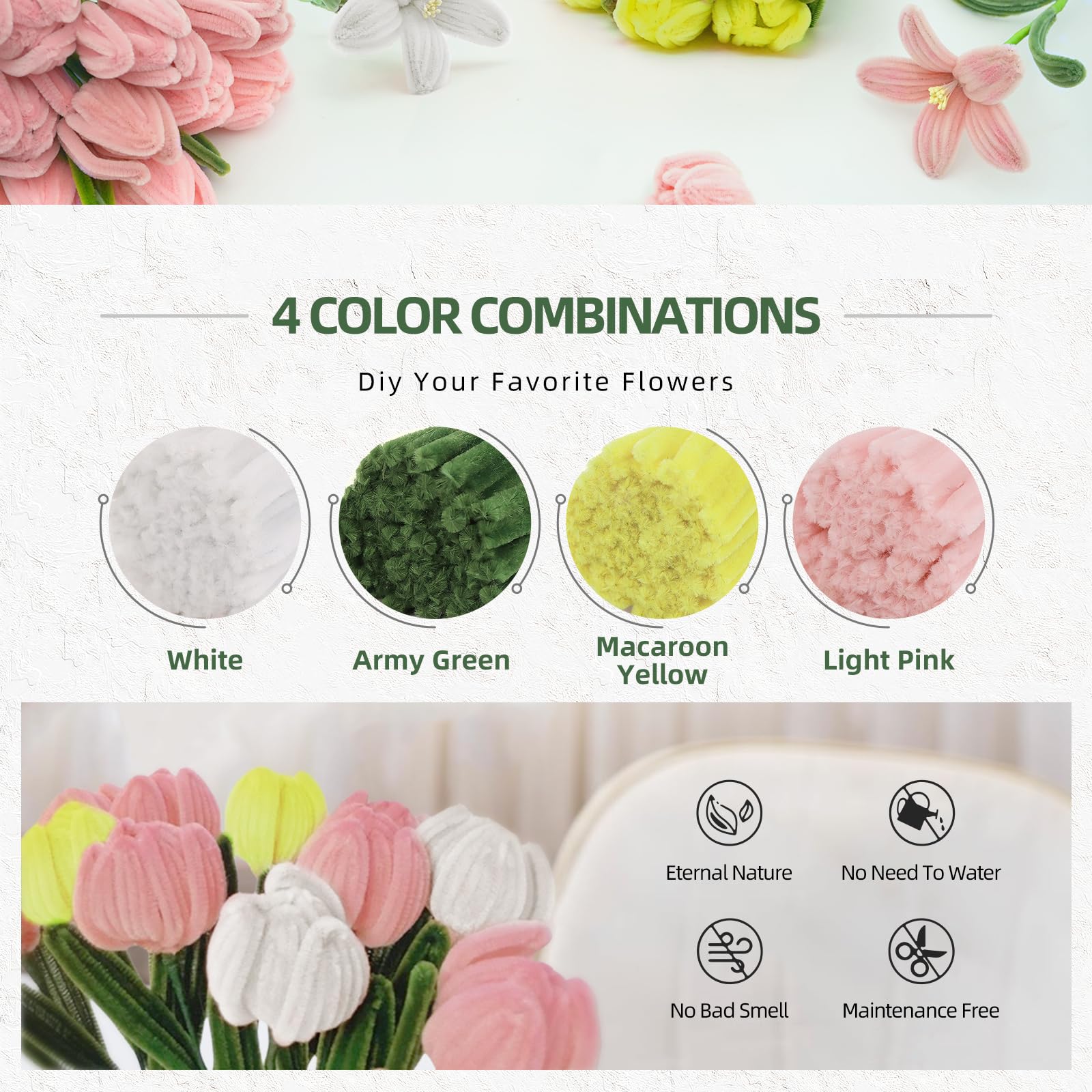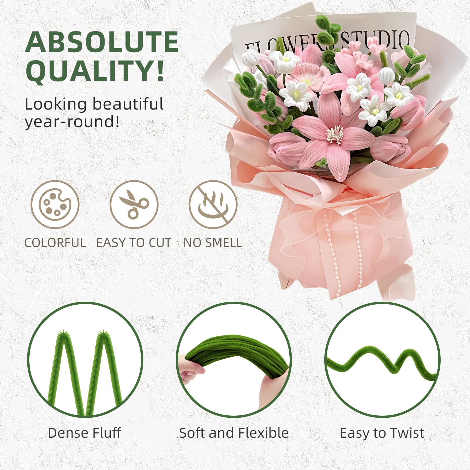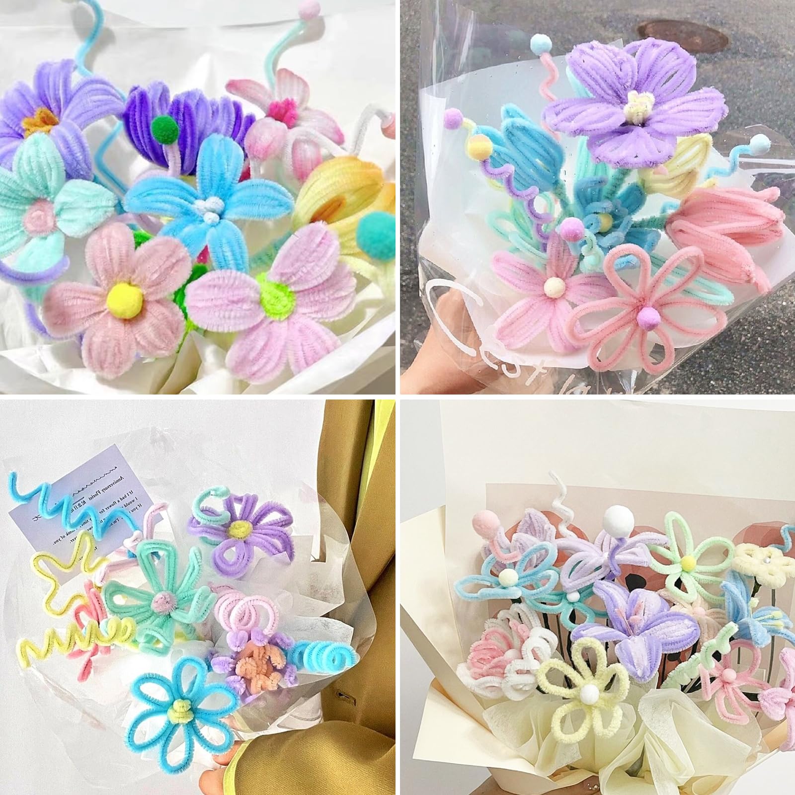 Oh man, dieses Pfeifenreiniger-Set ist ja mal total vielseitig für alle Bastelfans! Da sind 400 Pfeifenreiniger in 4 verschiedenen Farben dabei: 100x Hellrosa, 100x Dunkelrosa, 100x Pink und 100x Grün. Dazu gibt's noch jede Menge Zubehör wie grünes Bastelgarn, Klebeband, 150 Staubgefäße, Perlen, Band, Grußkarte und Geschenkpapier. Die Pfeifenreiniger sind aus hochwertigem Draht mit weicher, flauschiger Oberfläche - lassen sich super einfach biegen, knoten und schneiden. Perfekt um süße Blumensträuße zu machen, aber auch für andere Bastelprojekte. Die Anleitung ist auch für Anfänger gut verständlich. Egal ob für Geburtstage, Hochzeiten, Schulabschlüsse oder einfach so - damit kannst du einzigartige Geschenke basteln. Die Farben sind schön kräftig und die Qualität stimmt. Einfach alles auspacken und loslegen - der Kreativität sind keine Grenzen gesetzt! Super für Kindergeburtstage, DIY-Projekte oder um mal richtig abzuschalten beim Basteln.