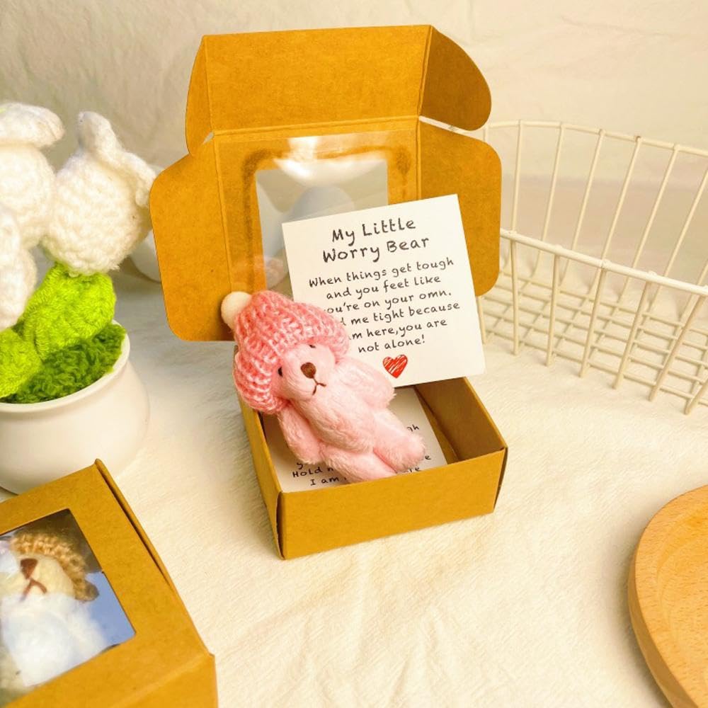 Manchmal braucht es nur eine kleine Geste, um jemandem Trost zu spenden - und dieser süße Sorgenbär in seiner Box ist genau das Richtige dafür! Der handgefertigte Mini-Plüschbär kommt in einer hübschen Box mit inspirierender Karte - perfekt für alle, die mal eine Umarmung brauchen.\n\nHergestellt aus hochwertigem Plüschstoff und gefüllt mit flauschiger PP-Baumwolle fühlt sich der Bär ultraweich und kuschelig an. Einfach zum Festhalten und Drücken, wenn's mal nicht so läuft.\n\nSuper kompakt - passt auf jeden Schreibtisch, Nachttisch oder ins Bücherregal. Sieht nicht nur niedlich aus, sondern erinnert auch immer daran, dass jemand an dich denkt.\n\nPerfektes Geschenk für Freunde, Partner oder Familienmitglieder bei Trauer, Stress oder einfach mal als Aufmunterung. Aber auch für fröhliche Anlässe wie Geburtstage oder Feiertage geeignet.\n\nDie braune Farbe ist dezent und passt überall hin. Ein Geschenk, das von Herzen kommt und wirklich Bedeutung hat.\n\nManchmal sagen kleine Bären mehr als tausend Worte - dieser hier wird garantiert zum treuen Begleiter in guten und schlechten Zeiten!