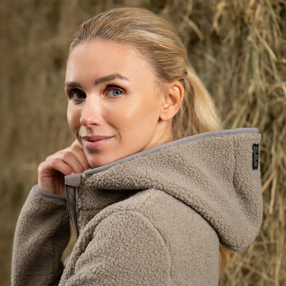 Stylish und super kuschelig - die Pikeur Teddyfleece Jacke für Damen in trendigem Greige! Die Sherpa Fleecejacke mit fester Kapuze wärmt dich an kühlen Tagen perfekt. Das besondere Bouclegarn speichert die Wärme ausgezeichnet, ohne dass du dich aufgebläht fühlst. Mit dem 2-Wege Reißverschluss und den Seitenschlitzen hast du totale Bewegungsfreiheit - perfekt fürs Reiten oder einfach für unterwegs. Die praktischen Seitentaschen und das Magnet-Klick-System an der Kapuze machen die Jacke zum echten Allrounder. Oberschenkellang geschnitten, damit auch dein Po immer schön warm bleibt!
