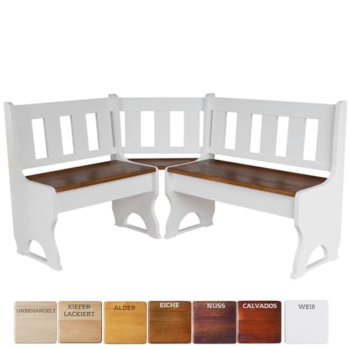 Diese richtig gemütliche Eckbank aus massivem Kiefernholz macht jeden Essbereich zum Wohlfühlort! Handgefertigt und super stabil verarbeitet, passt sie perfekt in deine Küche oder ins Esszimmer. Der weiße Mattlack-Look ist zeitlos schön und leicht zu reinigen. Mit den Maßen 120x160cm (an der Wand gemessen) bietet sie reichlich Sitzplatz für Familie und Gäste. Praktisch: Unter der Sitzfläche versteckt sich Stauraum für Decken, Kissen oder was du sonst so verstecken willst. Die Sitzhöhe von 45cm ist angenehm, die Bank ist 86cm hoch und die Sitzfläche 36cm tief. Cooler Feature: Du kannst sie in beide Richtungen aufbauen, je nachdem wie dein Raum es am besten hergibt. Alles für den Aufbau liegt bei - also ran an den Schraubendreher und in wenigen Schritten zu deiner neuen Lieblingsecke!