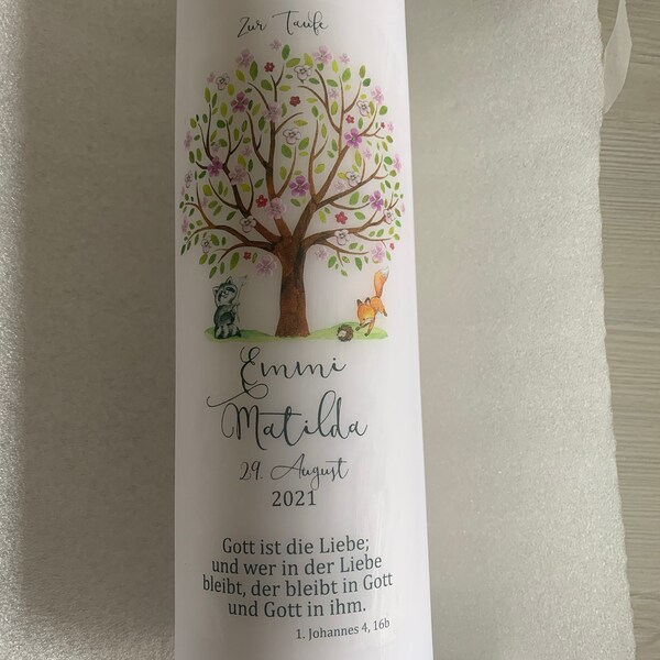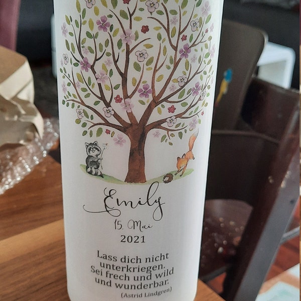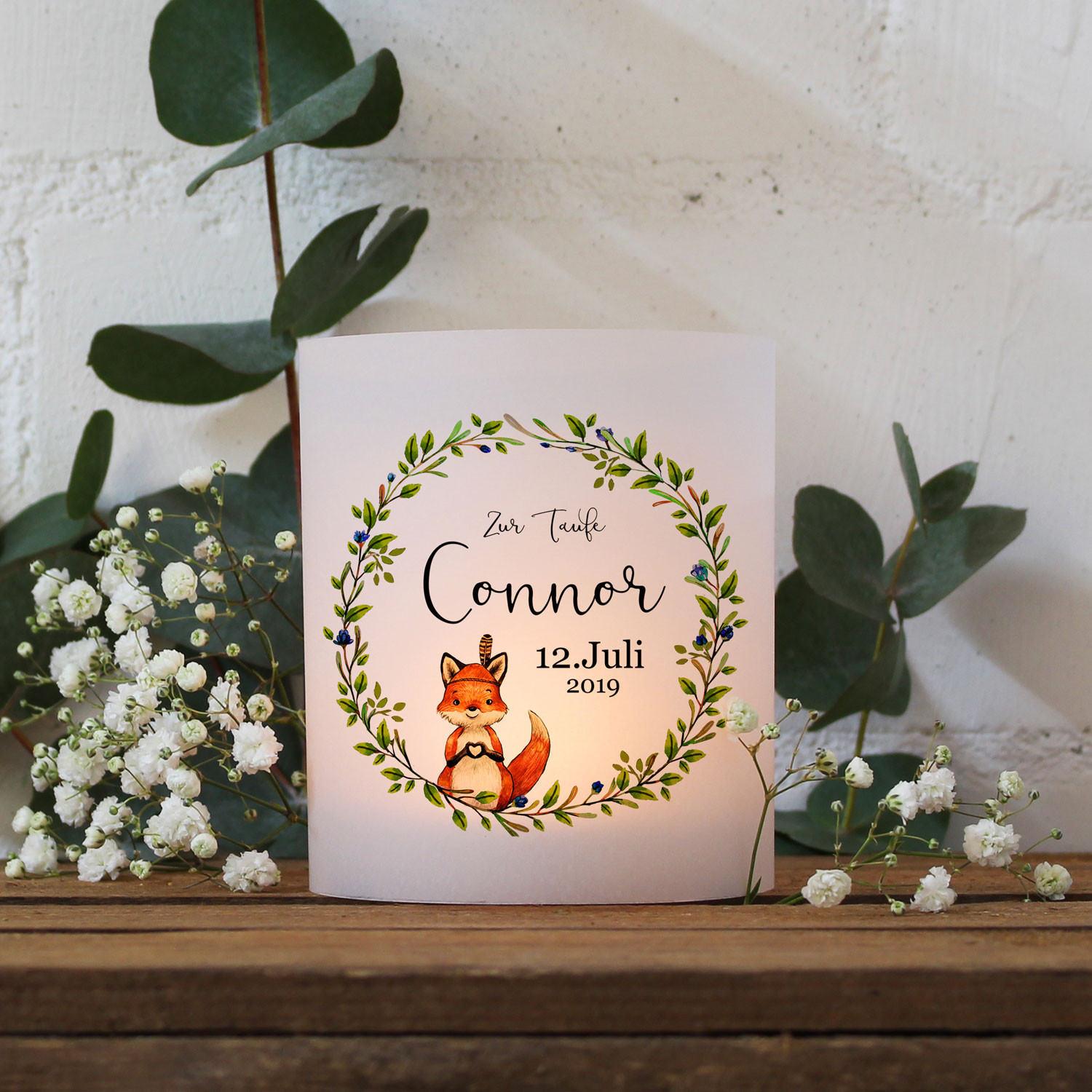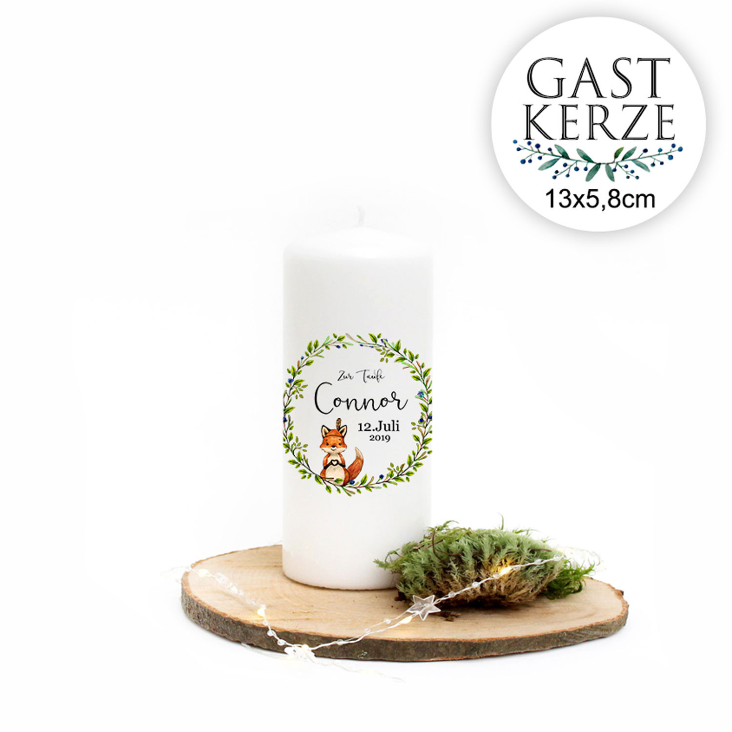 Eine ganz besondere Taufkerze für den großen Tag! Diese wunderschöne Kerze mit niedlichem Fuchs und Waschbär Motiv wird in Deutschland handbemalt und kann komplett individualisiert werden. Einfach nach dem Kauf deinen Wunschnamen, Taufdatum und Spruch mitteilen - wir drucken alles perfekt auf. Aus hochwertigen, geprüften Materialien für sicheren Abbrand. Erhältlich in verschiedenen Größen: Taufkerze (25cm), Patenkerze (18cm) oder als praktische Gastkerze (10cm). Mit passenden Lichthüllen erhältlich. Maße Gastkerze: 10cm hoch, 5cm Durchmesser. Wird innerhalb 1-2 Werktagen versendet. Schaff unvergessliche Erinnerungen!