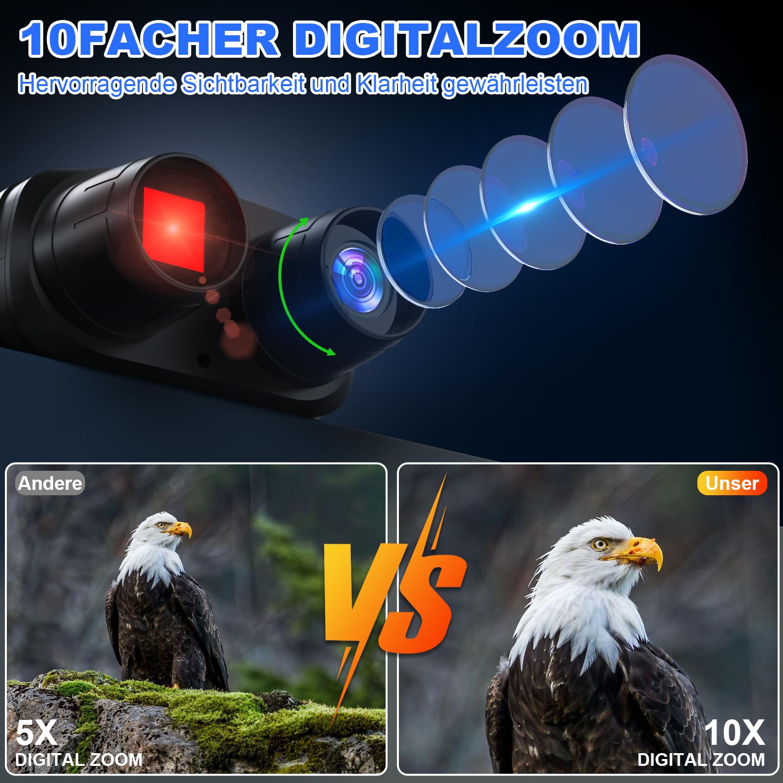 Wow, mit diesem Nachtsichtfernglas siehst du wirklich alles! Egal ob bei völliger Dunkelheit oder in der Dämmerung - die 5K Ultra HD Auflösung liefert gestochen scharfe Bilder. Mit dem 10-fachen Digitalzoom kommst du deinem Ziel ganz nah, bis zu 600 Meter weit. Perfekt für Jäger, Vogelbeobachter oder einfach fürs Camping.