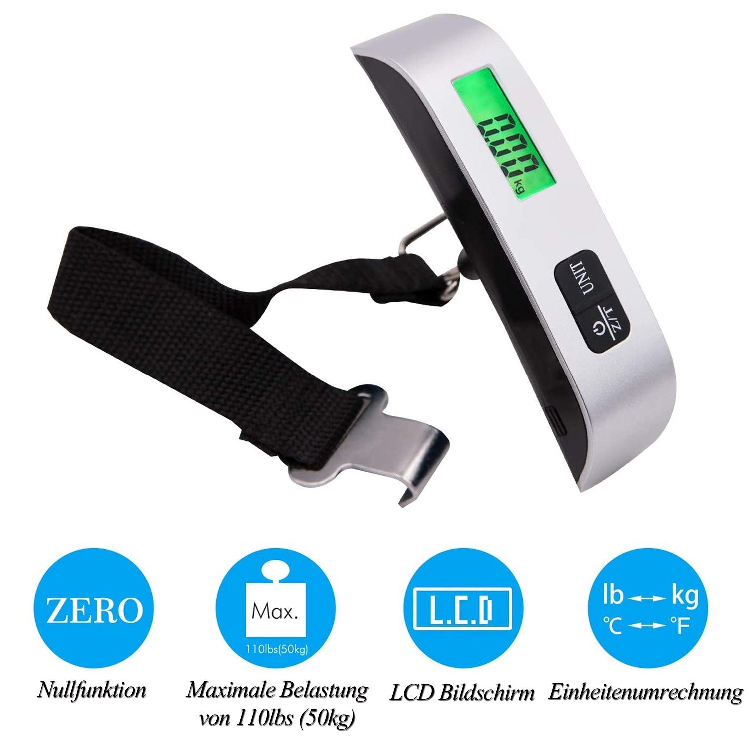 Ideal für Gepäck vor dem Flug, beim Angeln für den Fang oder im Haushalt für verschiedene Wiegeaufgaben. Einfache Bedienung, sofort einsatzbereit. Dein treuer Begleiter für unterwegs!