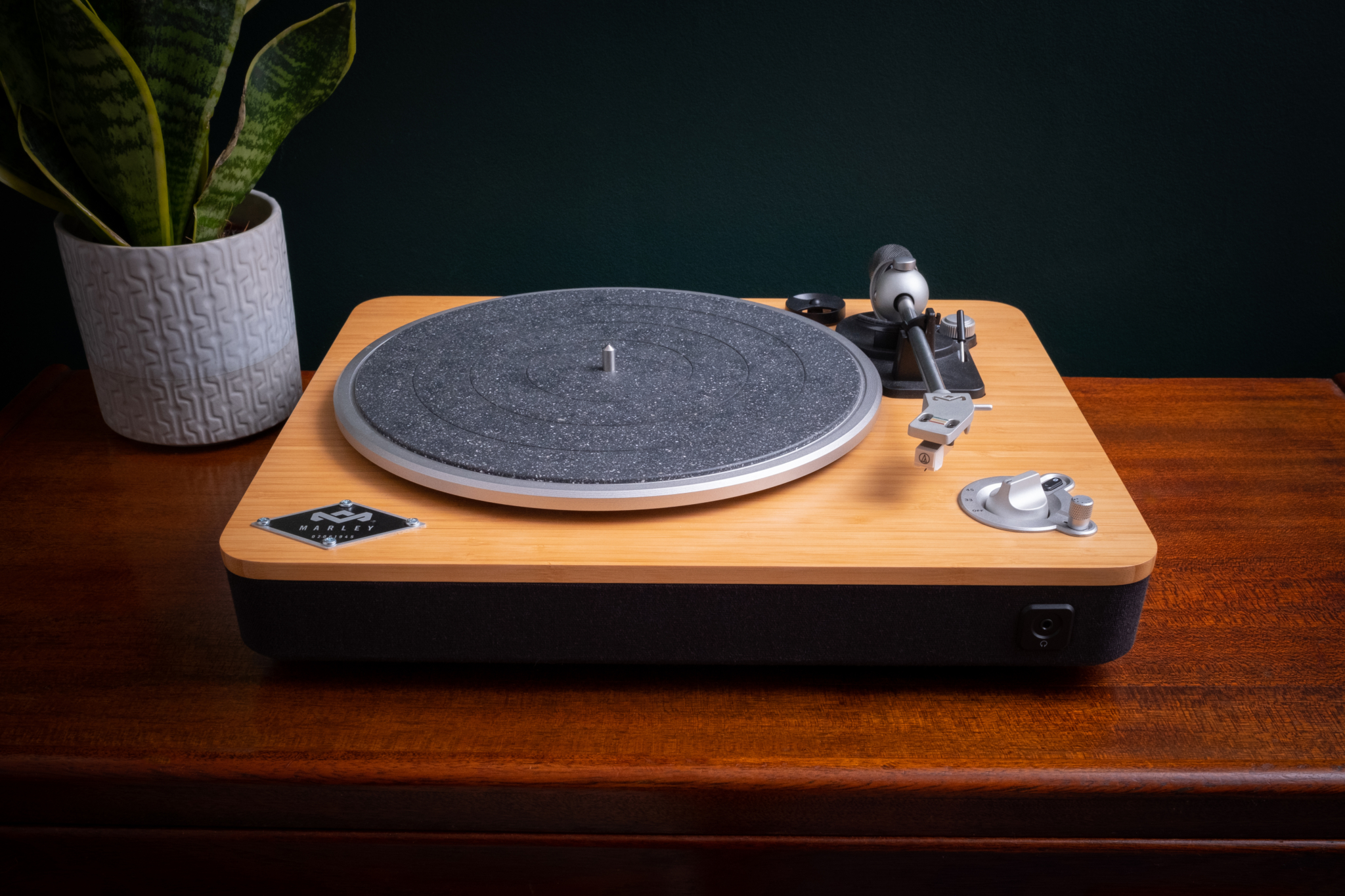 Hey, dieser House of Marley Plattenspieler ist was Besonderes! Der 'Stir It Up' in Bambus-Optik sieht nicht nur mega stylisch aus, sondern ist auch komplett nachhaltig produziert. Bambus, recyceltes Plastik und Aluminium - da fühlst du dich gleich besser beim Musikhören. Kabellos streamst du deine Lieblingsvinyls über Bluetooth 5.1 auf deine Lautsprecher. Der Riemenantrieb sorgt für stabilen Lauf bei 33 oder 45 U/min. Und weißt du was das Coole ist? Du kannst deine Vinyls sogar digitalisieren! Einfach per USB an PC oder Mac anschließen und aufnehmen. Mit integriertem Vorverstärker passt er zu allen Receivern. Für alle, die Vinyl lieben aber nicht auf modernen Komfort verzichten wollen. Nur Lautsprecher sind nicht dabei - die brauchst du noch.
