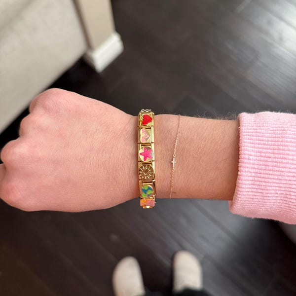 Total süß dieses Italian Charm Armband von Loozykit! Du kannst es ganz easy selbst zusammenstellen – die kleinen Charms (jeweils 9mm) einfach mit dem Werkzeug anbringen und dein persönliches Armband kreieren. Gefertigt aus robustem Edelstahl, vergoldet und farbenfroh designt. Perfekt, um es immer wieder umzugestalten – je nach Outfit oder Laune. Super als Geschenkidee für Teens oder zum Selberbehalten. Liegt angenehm am Handgelenk und sieht viel teurer aus, als es ist. Einfach mal ausprobieren und der Kreativität freien Lauf lassen – ob mit allen Charms oder nur ein paar ausgewählten... macht einfach Spaß!