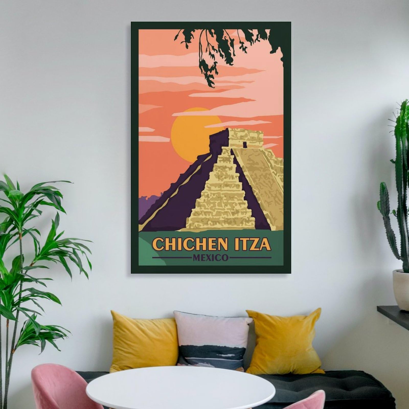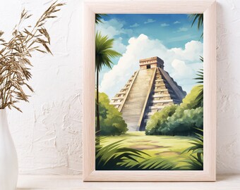 Urlaubsfeeling für deine Wände! Dieses wunderschöne Chichen Itza Poster bringt mexikanisches Flair in dein Zuhause. Das Vintage-Design zeigt den berühmten Kukulcan-Tempel bei Sonnenuntergang - einfach atemberaubend! Als Leinwanddruck in 60x90cm ist es ein echter Hingucker im Wohnzimmer, Büro oder Flur. Hochwertiger Digitaldruck mit lebendigen Farben - sieht aus wie ein teures Gemälde! Wird auf Bestellung angefertigt, damit die Qualität stimmt. Einfach aufhängen und schon fühlst du dich wie in Mexiko! Perfekt für Reise-Fans oder alle, die ihr Zuhause mit schönen Erinnerungen schmücken wollen.