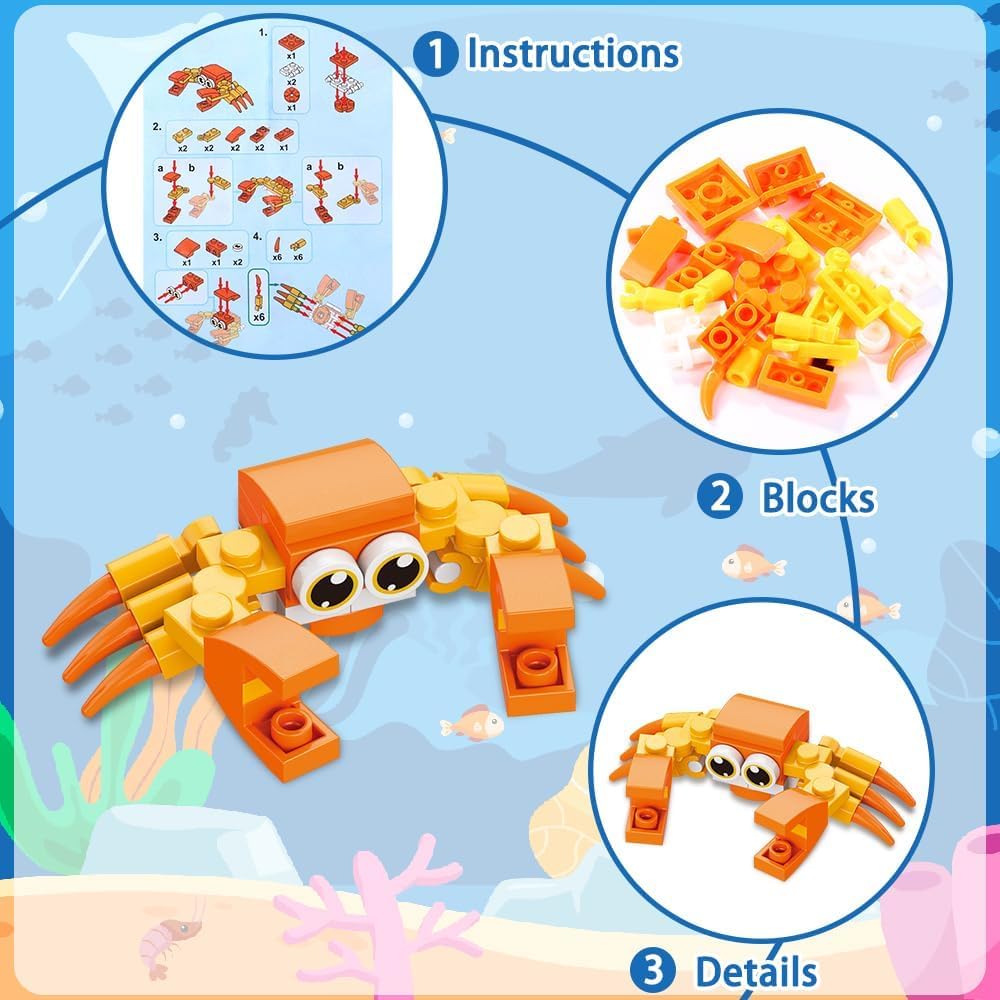 Perfekte Mitgebsel für die nächste Kinderparty! Dieses Set enthält 12 verschiedene Tier-Bausteine in einzelnen Verpackungen - ideal als Gastgeschenk. Enthalten sind: Clownfisch, Krake, Laternenfisch, Krabbe, Krebs, Mantarochen, Hai, Butterfisch, Rosa Delfin, Meeresschildkröte, Schwertfisch und Orca. Hergestellt aus hochwertigem, ungiftigem ABS-Material mit glatten Kanten. Fördert spielerisch die motorischen Fähigkeiten, räumliches Denken und Kreativität. Perfekt für Kinder von 4-12 Jahren. Auch super als Klassenpreis, für Goodie-Bags oder als kleines Geschenk zu Weihnachten und Ostern. Mach die nächste Geburtstagsfeier deines Kindes zu einem unvergesslichen Erlebnis!