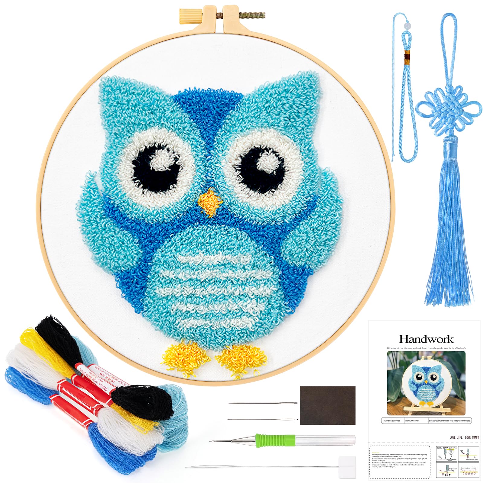 Alles was du brauchst, ist dabei: 2 Stickrahmen (8 Zoll), vorgedrucktes Sticktuch, Punch Needle, Einfädler, Schere, Nadeln, Faden und sogar weiße und gelbe Perlen für's Verzieren.