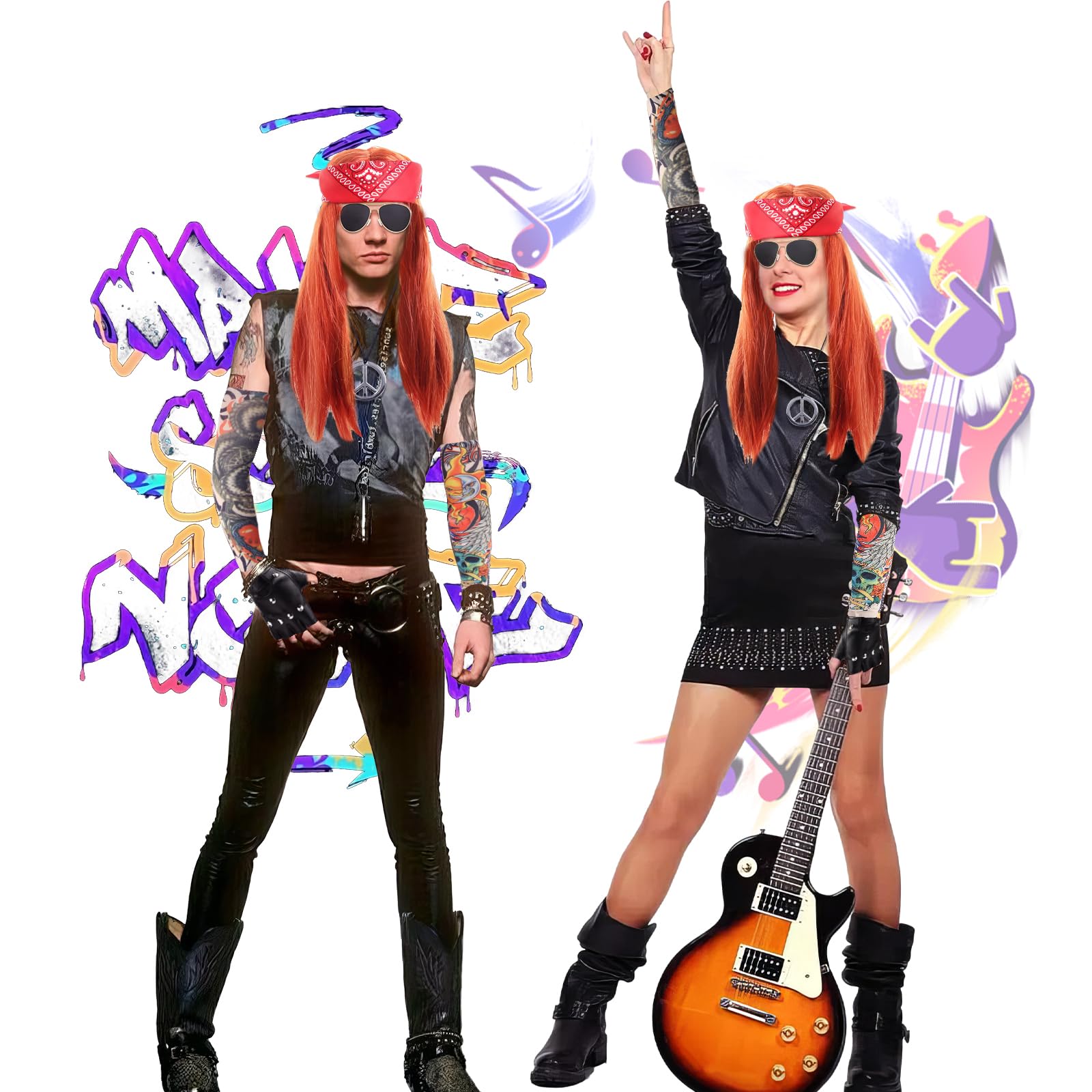 Werde zur Legende auf der nächsten Party! Dieses komplette Punk Rock Set verwandelt dich in einen echten Rockstar. Enthalten ist alles, was du brauchst: eine knallige orange Longhair-Perücke, coole Sonnenbrille mit Silberrahmen, punkige Handschuhe, temporäre Tattoo-Ärmel, ein stylisches Armband und ein Kopftuch. Die Materialien sind hochwertig und bequem - die Handschuhe aus weichem PU-Leder rutschen nicht, die Tattoo-Ärmel aus dehnbarem Nylon/Spandex sitzen perfekt. Ob Halloween, Rockkonzert, Themenparty oder Cosplay - mit diesem Outfit fällst du garantiert auf! Alles lässt sich super einfach an- und ausziehen. Die Tattoos sehen ultra-echt aus, und die Perücke gibt dir diesen authentischen 70er/80er Rock-Vibe. Einfach anziehen und die Show starten - bleibender Eindruck garantiert!