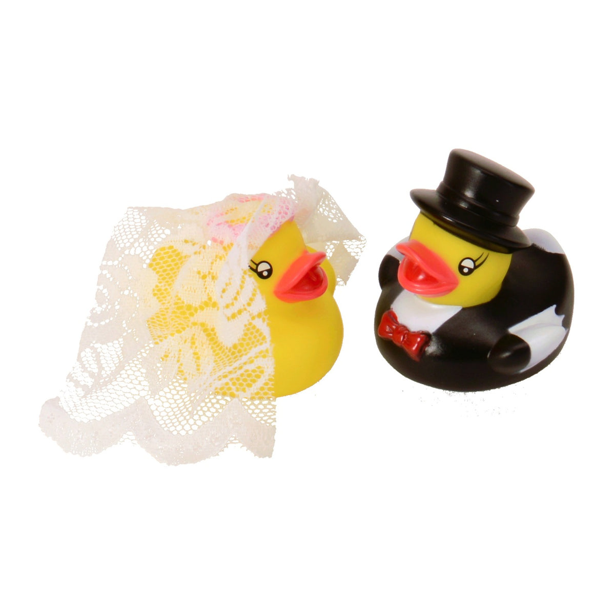 Wie niedlich ist das denn? Dieses Quietscheente-Set für Hochzeiten bringt garantiert jeden zum Lachen! Enthält 2 Gummienten (je 6x4,5cm) plus komplettes Zubehör: Schwarzer Zylinder, Krone, Goldkette, Perlenkette, Rock, Fliege und 2 herzförmige Sonnenbrillen. Alles sicher verpackt in ner eleganten Geschenkbox (15x9x5,5cm). Perfekt als Tischdekoration, für die Hochzeitstorte oder als witziges Geschenk fürs Brautpaar. Bringt ne lockere Stimmung auf die Feier und wird zu ner bleibenden Erinnerung. Einfach mit dem beiliegenden Klebeband zusammenstecken - schon hast du das süßeste Brautpaar ever!