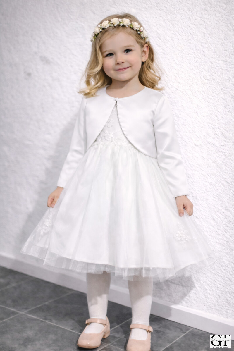 Das Highlight: Die wunderschöne 3D-Blume auf der Vorderseite! Die Jacke hat lange Ärmel, ist vorne offen und fällt als kurzes Crop Top aus. Sie passt perfekt über Blumenmädchen-Kleider oder festliche Outfits.