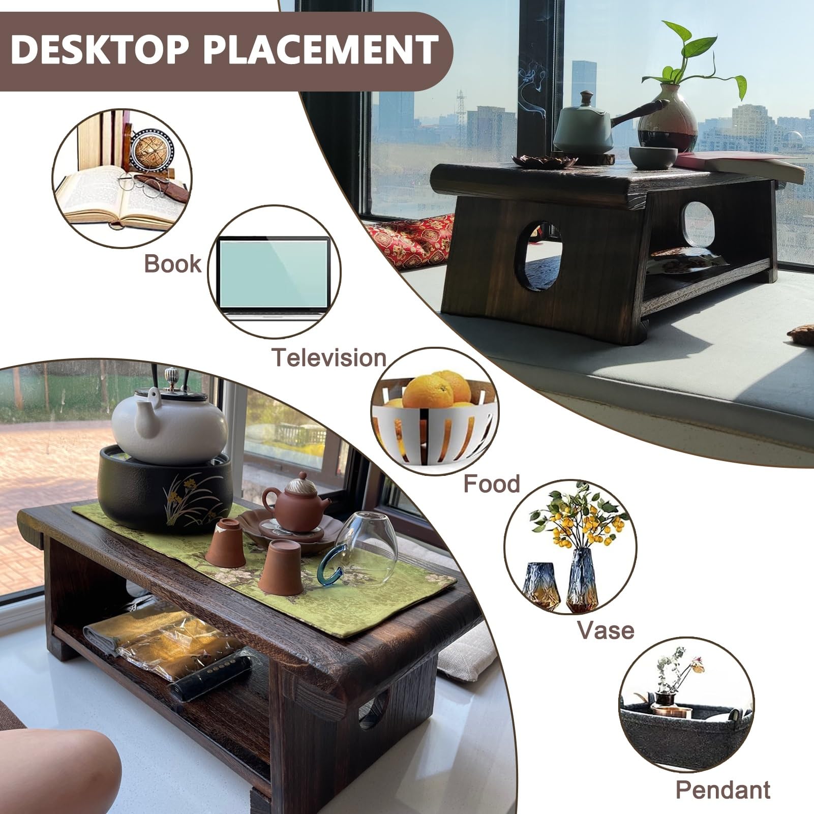 Authentischer japanischer Style für dein Zuhause! Dieser vielseitige Bodentisch aus leichtem Paulownia-Holz ist dein neuer Liebling für Entspannungsmomente. Perfekt als Meditationsaltar, Teetisch oder niedriger Couchtisch - die klappbaren Beine machen ihn super flexibel. Einfach aufstellen und sofort steht dein persönlicher Ruhepol bereit. Das antik wirkende Holz ist nicht nur schön anzusehen, sondern auch pflegeleicht - einfach mit feuchtem Tuch abwischen. Ob im Wohnzimmer, Schlafzimmer oder Meditationsraum - dieser Tisch passt sich jeder Situation an. Als Bett-Tablett zum Frühstücken genauso praktisch wie als Laptop-Unterlage. Leicht genug zum Tragen, stabil genug für den täglichen Gebrauch. Bring japanische Gelassenheit in deine vier Wände! Der Auf- und Abbau geht ohne Werkzeug - ideal wenn mal schnell Gäste kommen. Ein Möbelstück das nicht nur gut aussieht, sondern auch praktisch ist!