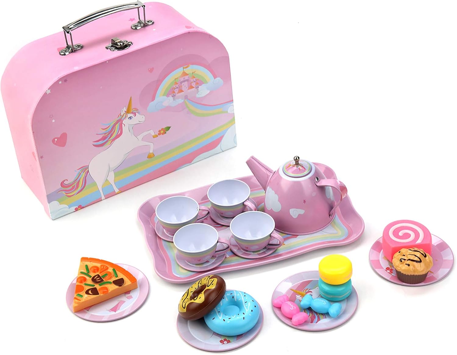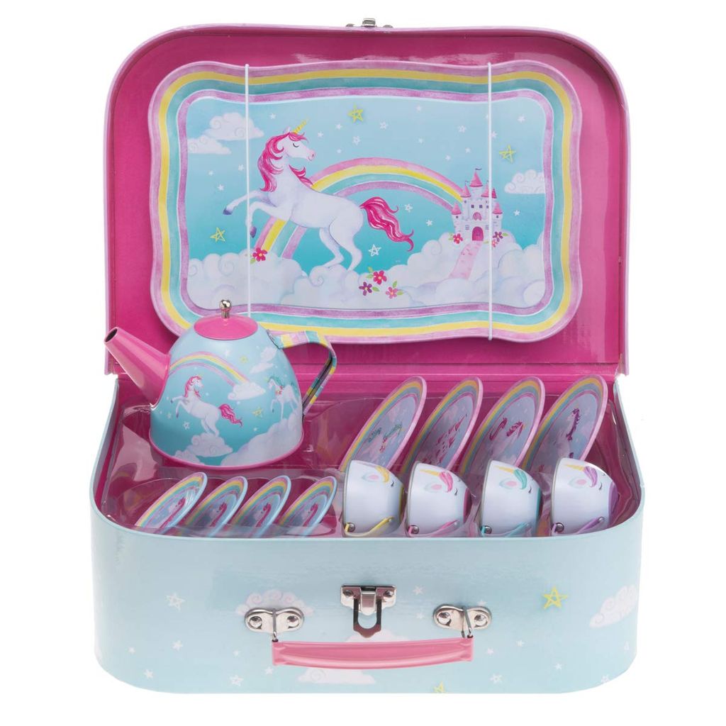 Oh wie süß! Dieses Einhorntraum-Spielgeschirr lässt Kinderherzen höher schlagen. Das komplette Set aus Metall kommt in einem stabilen Tragekoffer - super zum Mitnehmen oder Verstauen. Enthalten sind alles, was man für eine perfekte Teeparty braucht: 4 Tassen, 4 Teller, 4 Löffel, Teekanne, Milchkanne, Zuckerdose und Serviertablett. Die fröhlichen Einhorn-Motive mit Blumen und Schmetterlingen begeistern jede kleine Prinzessin. Fördert kreatives Spielen und macht riesig Spaß! Koffermaße: 29x19,5x9,5 cm. Das ideale Geschenk für Kinder ab 3 Jahren!