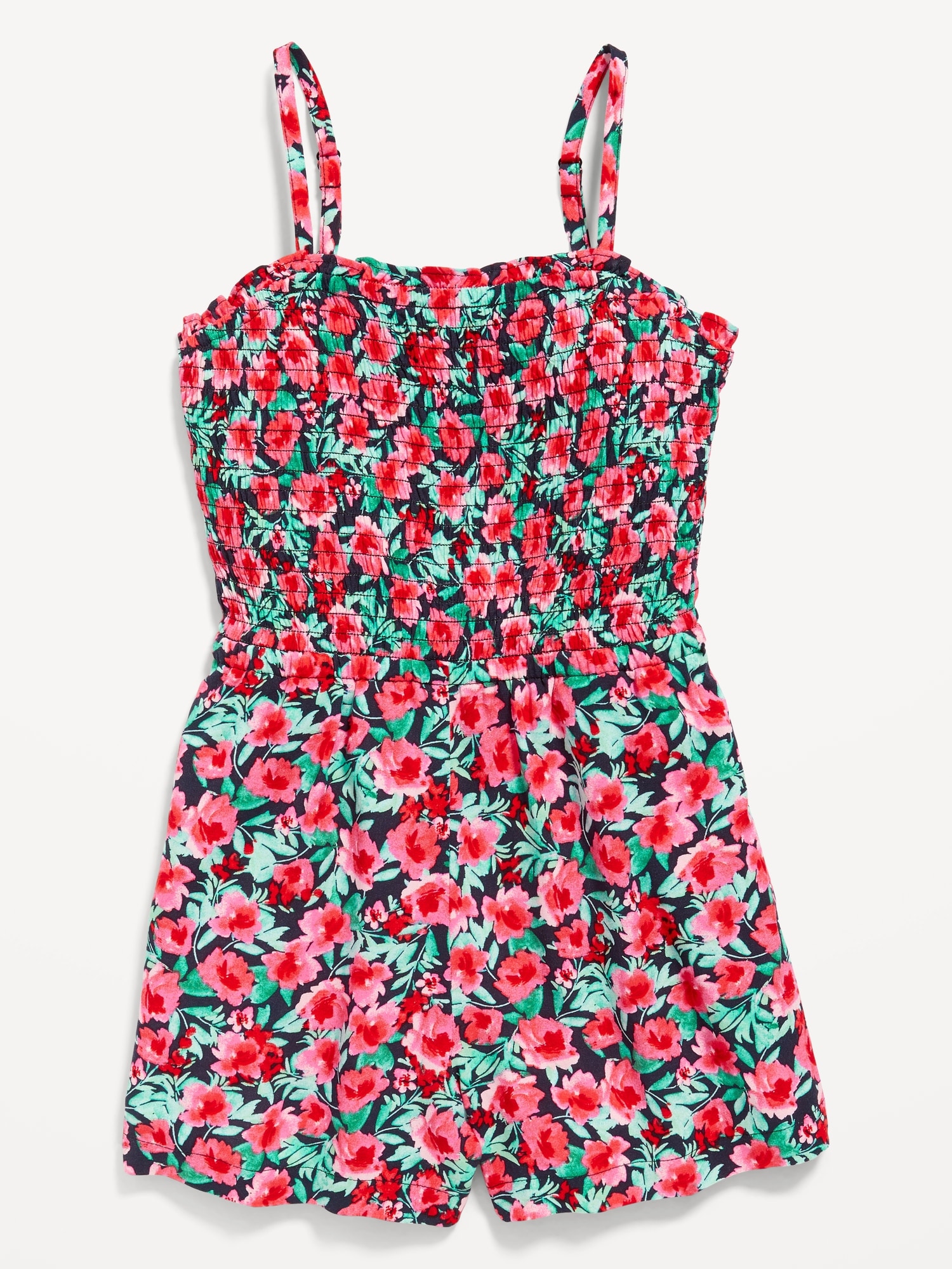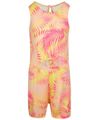Sommer, Sonne, Hurley-Style! Dieser süße geraffte Jumpsuit für Mädchen ist perfekt für warme Tage und jede Gelegenheit. Mit Allover-Print, elastischen Ärmeln und praktischer Kurzhosenschnitt.