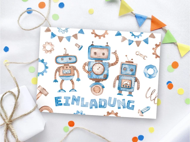 Hey, für die nächste Kindergeburtstags-Party sind diese Roboter-Einladungskarten ja mal total cool! Du bekommst 12 stabile Karten im A6 Format (10,5x14,8cm) mit dem süßen Roboter-Motiv. Hergestellt in Deutschland auf hochwertigem 300g/m² Bilderdruck und mit UV-Lack beschichtet - das sieht nicht nur gut aus, sondern ist auch robust gegen Verschmutzungen. Auf der Rückseite findest du vorgedruckte Felder zum Ausfüllen: Wann, Wo, Telefonnummer und sogar ein Extra-Feld für besondere Hinweise wie Mottoparty oder Wunschgeschenke. Perfekt für Jungs-Geburtstage, aber natürlich können die Karten auch für andere Anlässe wie Übernachtungspartys, Kino-Besuche oder Schwimmbad-Ausflüge verwendet werden. Falls du weniger Karten brauchst, gibt's das Motiv auch in 6er, 8er oder 10er Sets. Einfach die Daten eintragen, abschicken und sich auf eine coole Party freuen! Garantiert ein Hit bei allen kleinen Gästen!