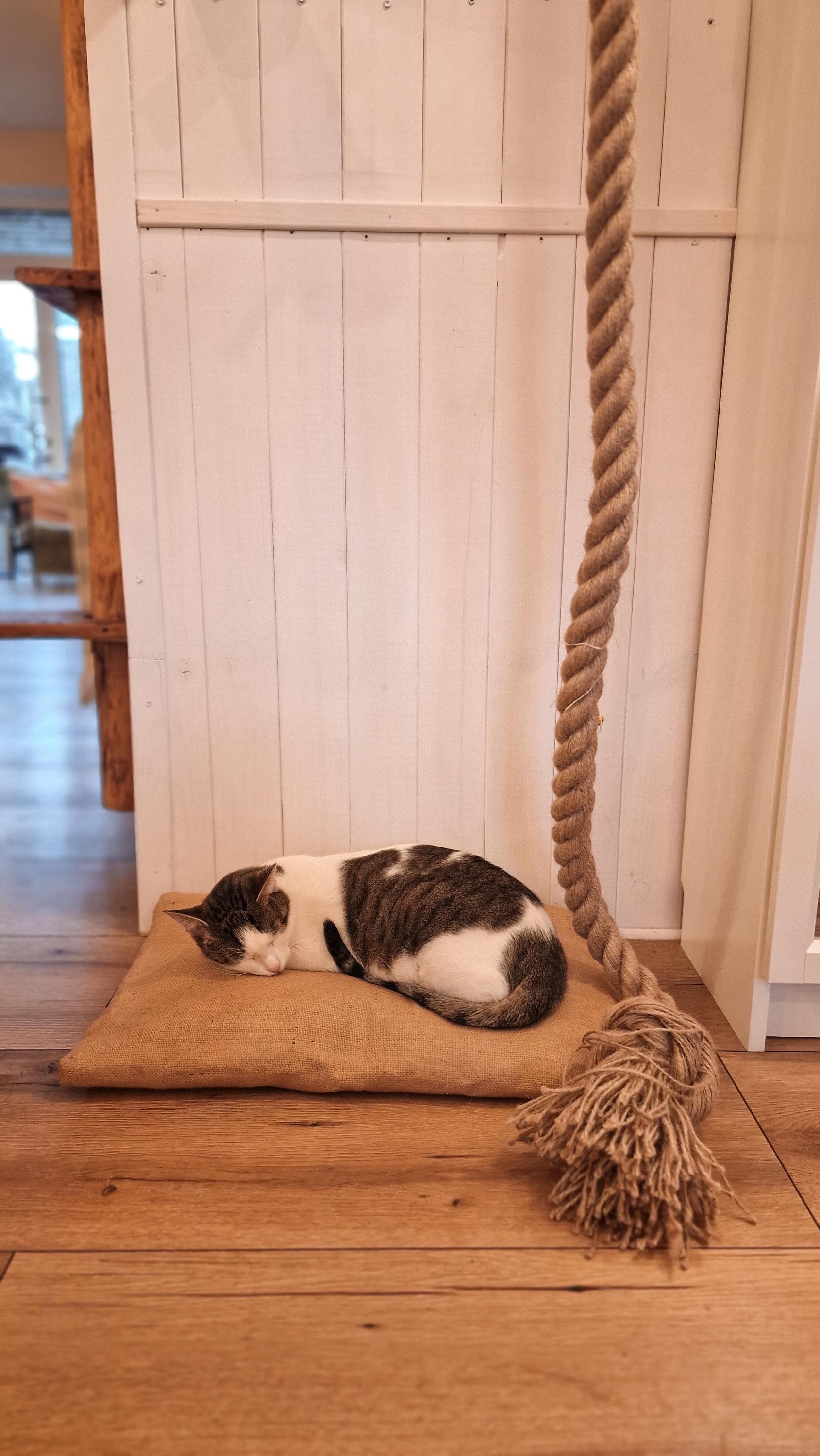 Oh, wie genial für deine Katze! Dieses Jute-Kletterseil ist der absolute Hit für alle Stubentiger. Mit 2,7 Meter Länge und 5 cm Durchmesser - da kann sich deine Katze so richtig austoben! Einfach an Decke oder Wand montieren mit den beiliegenden Haken und Schrauben. Der Federkarabiner sorgt für sicheren Halt. Deine Katze kann klettern, kratzen und von oben alles beobachten - genau wie sie's liebt! Das robuste Jutematerial ist ideal zum Krallenschärfen und hält auch wilden Kletteraktionen stand. Spart Platz im Vergleich zu großen Kratzbäumen - perfekt für Wohnungen! Einfach zu installieren, keine komplizierte Montage. Deine Katze wird's lieben - garantiert! Fördert ihre natürlichen Instinkte und hält sie fit. Super als Geschenk für Katzenfreunde oder um deiner eigenen Samtpfote was Gutes zu tun. Einfach aufhängen und zusehen wie deine Katze begeistert ist!