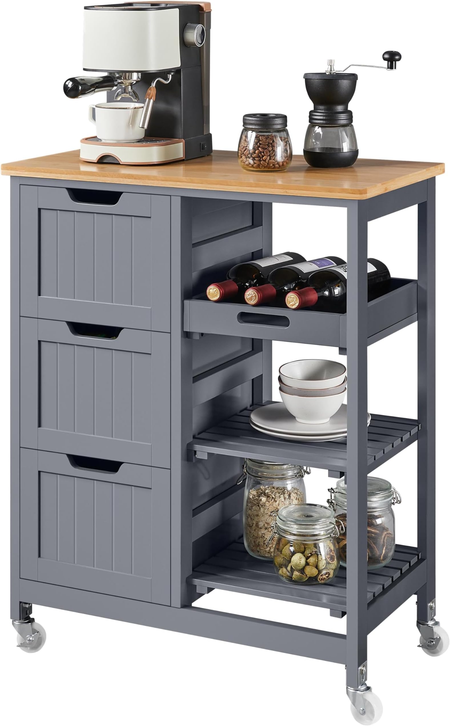 Ordnung und Stil für deine Küche! Dieser vielseitige Servierwagen von FANTASK bietet jede Menge Stauraum: 3 große Schubladen, 2 offene Fächer und ein herausnehmbares Tablett. Aus stabilem Kautschukholz, Kiefernholz und MDF gefertigt - trägt bis zu 61kg. Die 4 Lenkrollen (2 mit Bremse) machen ihn super mobil. Maße: 67x37x84cm - kompakt aber geräumig. Die glatte, umweltfreundlich lackierte Oberfläche ist leicht zu reinigen. Perfekt als Küchenorganizer, Barwagen, Beistelltisch oder fürs Home-Office. Einfacher Aufbau mit bebilderter Anleitung. Ob in der Küche, im Wohnzimmer oder Flur - dieser Wagen bringt Ordnung und sieht dabei noch toll aus! Hol dir mehr Platz und Organisation - bestell jetzt!