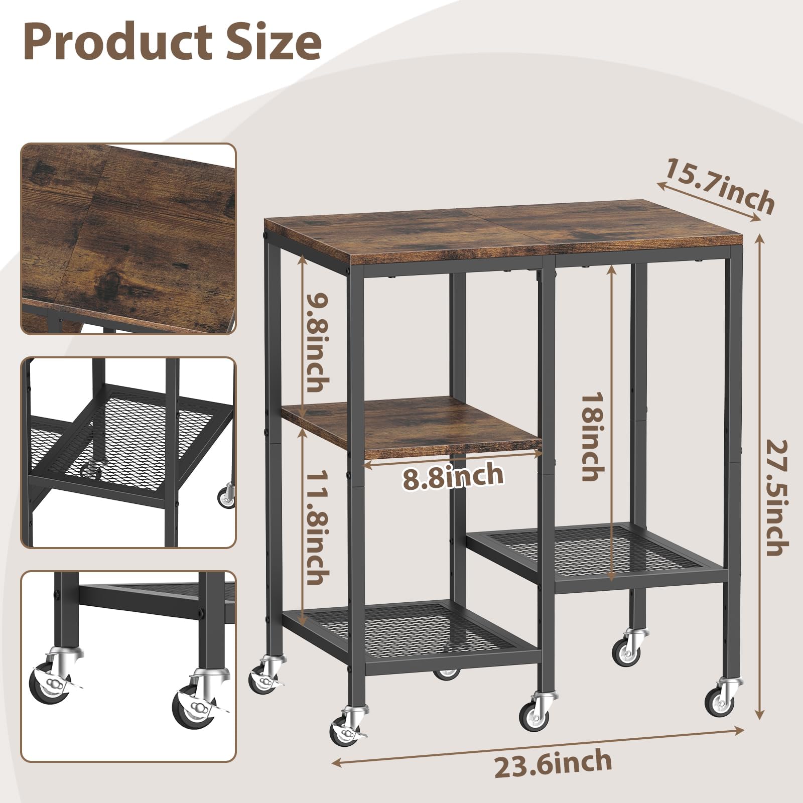 Dieser praktische Küchenwagen bringt Ordnung in deine Küche! Mit 4 Etagen hast du genug Platz für Mikrowelle, Kaffeemaschine, Toaster und all den Kram, der sonst rumsteht. Die Maße von 60x40x70 cm sind ideal für kleine Küchen. 6 Rollen - davon 2 mit Bremse - machen ihn super mobil. Einfach wo hinschieben, wo du Platz brauchst. Aus Holzspanplatte mit wasserfester Beschichtung, also hält er auch mal was aus. Die Kombi aus braunen Regalbrettern und schwarzem Metallrahmen sieht richtig edel aus. Montage ist easy - in ca. 15 Minuten steht er. Perfekt auch als Barwagen, Bücherregal oder Pflanzenständer - total vielseitig!