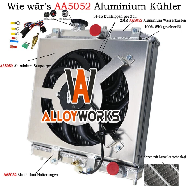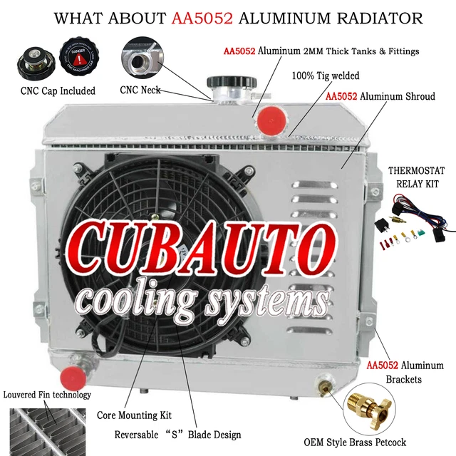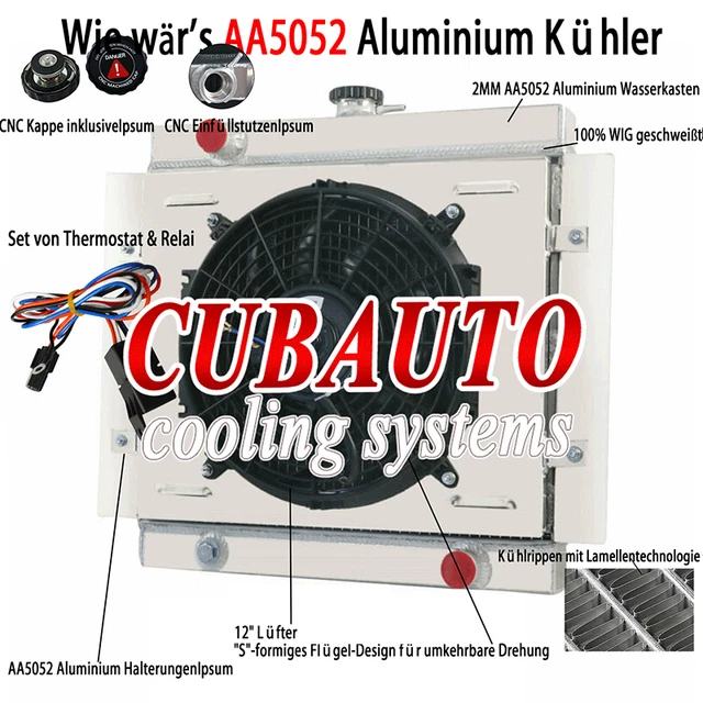 Top-Kühlleistung für deinen Oldtimer! Dieser massive Aluminium-Kühler mit Lüfter ist speziell für Ford HI-BOY Grillschalen und Chevy V8 Motoren entwickelt. Bring deinen Klassiker auf die optimale Betriebstemperatur.