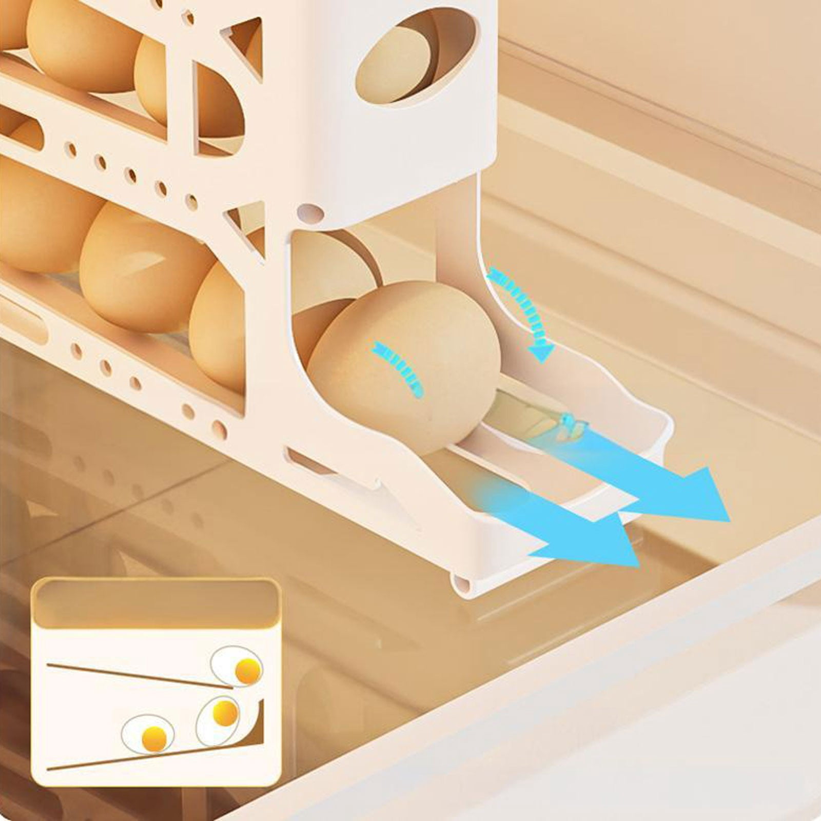 Endlich Ordnung im Kühlschrank für deine Eier! Dieser clevere Eierhalter hat ein geniales Rollsystem - wenn du vorn ein Ei nimmst, rollen die anderen automatisch nach. Nie wieder rumkramen für die Eier hinten im Fach!