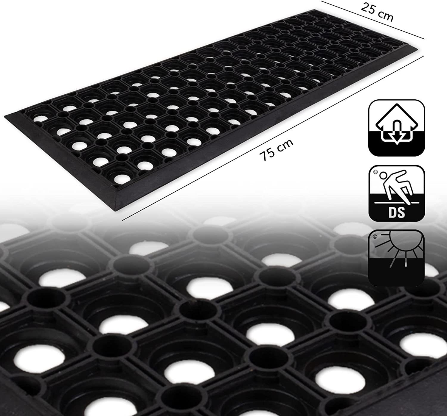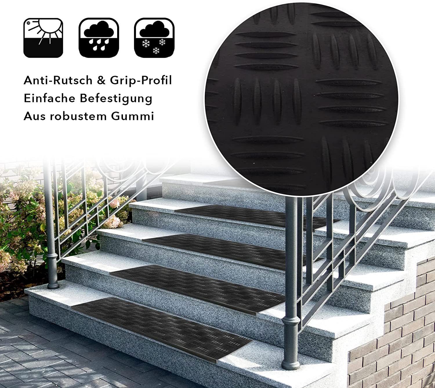 Perfekter Schutz für deine Treppen! Diese robusten Gummistufenmatten im 5er-Set sind genau das Richtige, um rutschige Stufen sicher zu machen. Mit den Maßen 30x120 cm passen sie auf die meisten Standardtreppen und die 25 mm Abkantung gibt extra Halt. Aus wetterfestem Vollgummi halten sie auch bei Regen, Schnee und Sonne super durch - egal ob innen oder außen. Montage ist total easy: Einfach Stufen gut reinigen, Schutzfolie von der Klebefläche abziehen und fest andrücken. Du kannst sie aber auch bohren oder mit Kabelbindern befestigen. Die Diamond-Struktur sieht nicht nur gut aus, sondern sorgt für maximalen Grip. Deine Stufen sind damit nicht nur sicherer, sondern auch geschützt vor Abnutzung und Schmutz. Reinigen geht fix mit Besen oder feuchtem Tuch. Für Holztreppen, Steintreppen, Marmor oder Metallgitter geeignet - ein echter Allrounder für mehr Sicherheit im ganzen Haus!