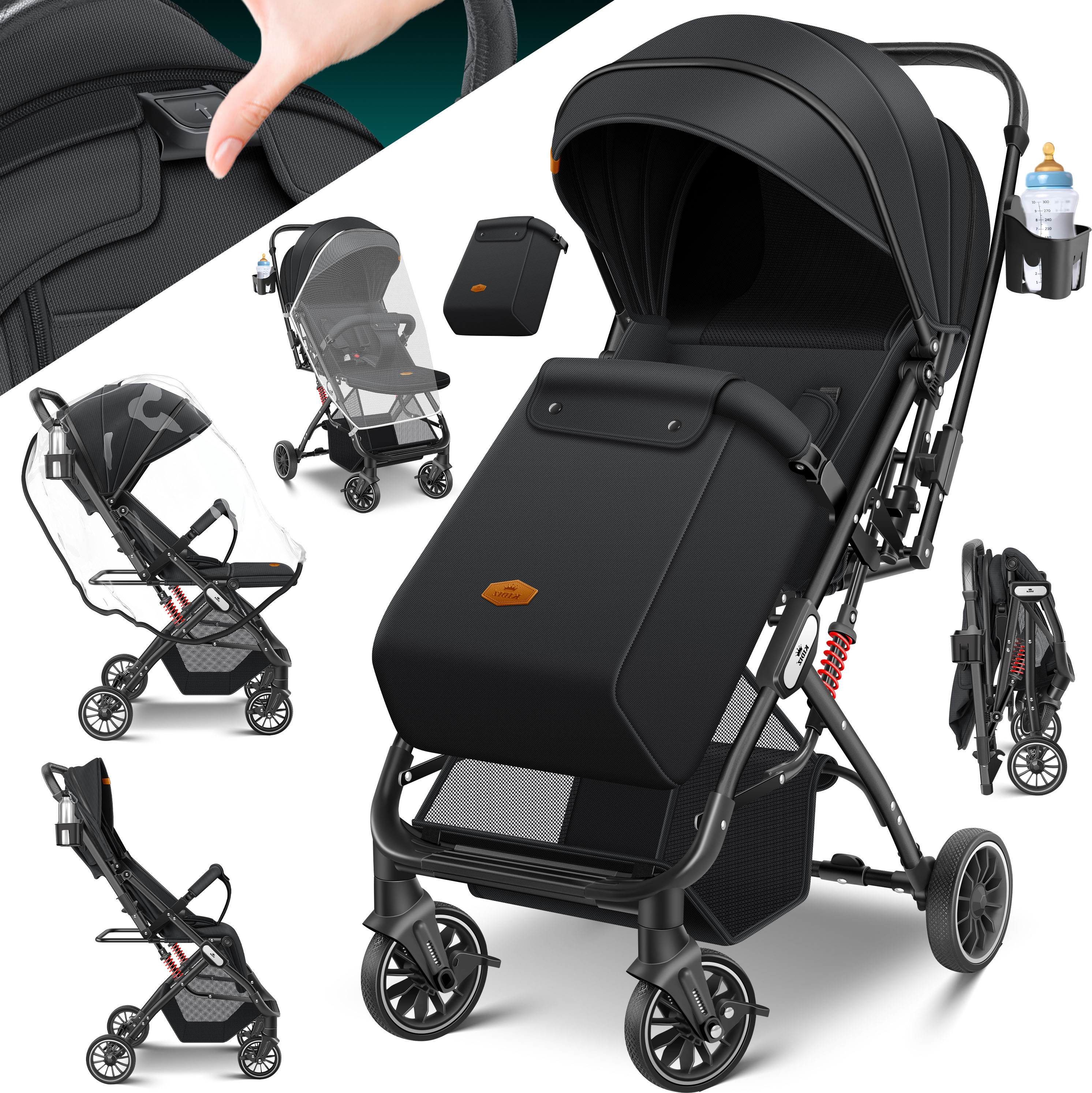 Das Komplettpaket hat alles dabei: Fußsack für kalte Tage, Regenschutz für nasses Wetter, Moskitonetz für den Sommer und sogar einen Getränkehalter. Der große Stauraum unter dem Sitz bietet Platz für Wickeltasche und Einkäufe.