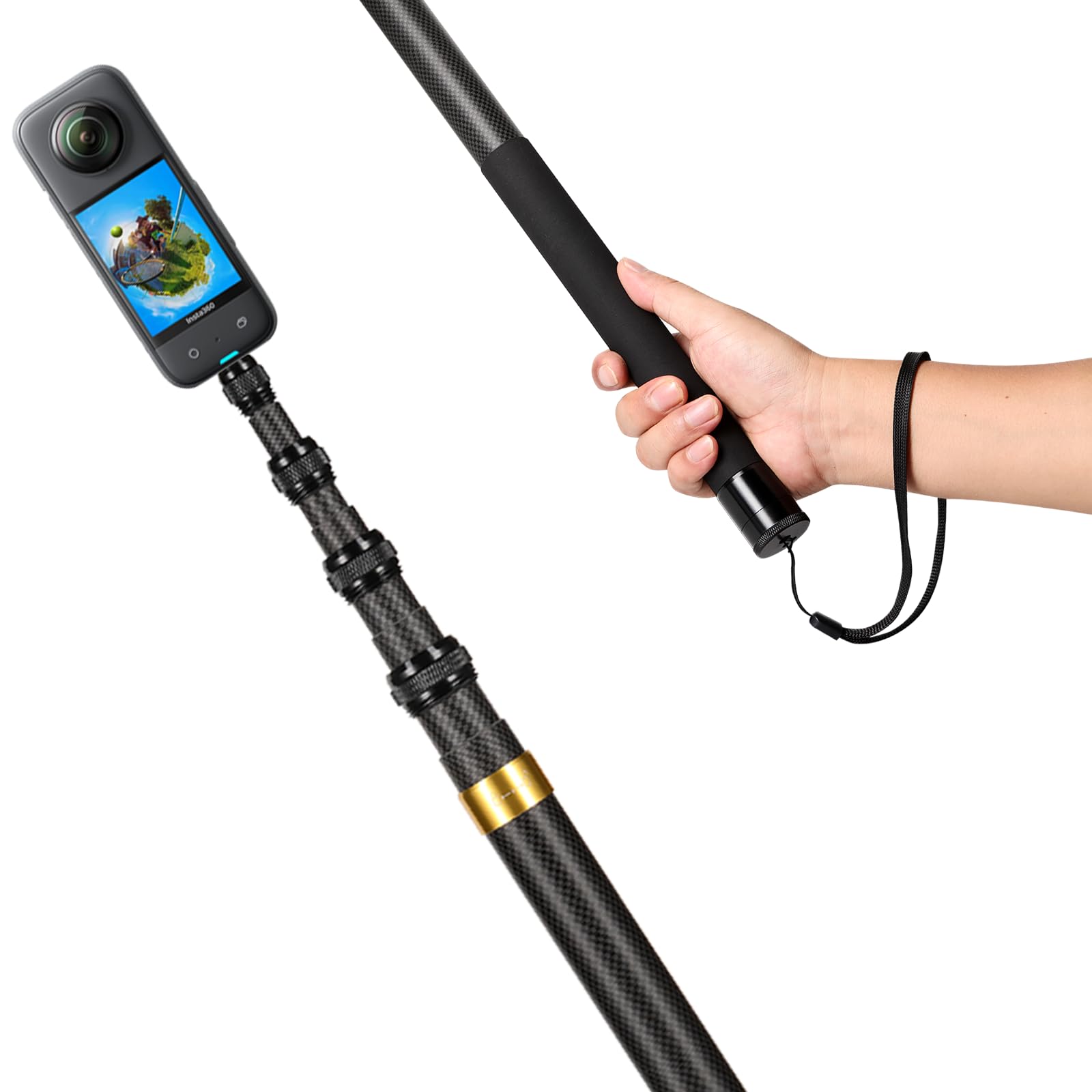 Perfekte Aufnahmen aus jeder Perspektive! Dieser Karbonfaser-Selfie-Stick wird bis zu 3 Meter lang und ist damit ideal für spektakuläre 360° Aufnahmen. Superleicht mit nur 352g aber dennoch extrem stabil. Passt perfekt für Insta360 ONE X5, X4, X3, X2, X, RS, R und DJI Osmo Kameras. Das unsichtbare Design sorgt für professionelle Aufnahmeeffekte. Vier ausziehbare Längen: 36cm, 120cm, 240cm und 300cm. 180° drehbar für jeden Winkel. Perfekt für Reisen, Sport oder Gruppenfotos. Einfach ausziehen und beeindruckende Aufnahmen machen!