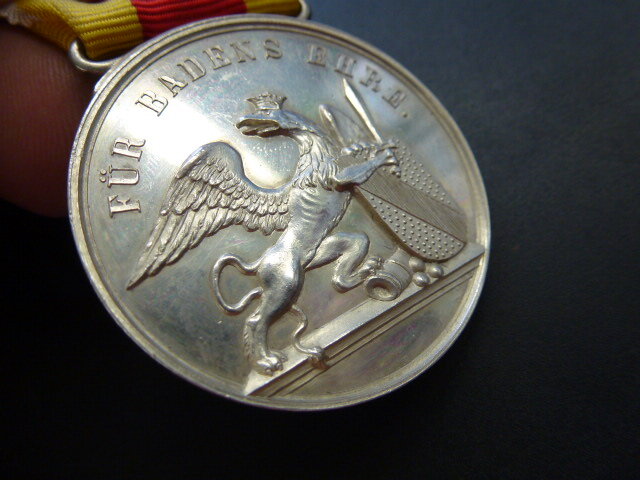 Diese hochwertige Reproduktion der historischen Karl-Friedrich-Militärverdienstmedaille ist ein echtes Sammlerstück! Im originalen Design des Großherzogtums Baden aus dem 19. Jahrhundert. Mit ca. 48mm Durchmesser aus Metall mit silberfarbener Beschichtung. Vorderseite mit dem badischen Löwen und der Umschrift 'Für Badens Ehre'. Rückseite mit Lorbeerkranz und der Inschrift 'Dem Tapfern'. Inklusive passendem Ordensband in den originalen Farben. Perfekt für Sammler militärhistorischer Objekte, Reenactment, zur Vervollständigung von Uniformen oder als Deko-Stück. Ein Stück Geschichte für deine Sammlung!